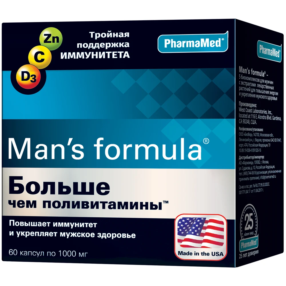 Защитить мужской организм от инфекций и вирусов позволяет прием биокомплексаMan's formula® Больше чем поливитамины™, который разработан специально для мужчин и содержит 20 витаминов, 11 минералов, среди которых Цинк, Витамин D3 и Витамин С в необходимых дозировках, что позволяет не заболеть, облегчает течение болезни и ускоряет процесс выздоровления. Также в составе 4 экстракта специальных лекарственных растений, которые заботятся о мужском здоровье –экстракт Карликовой пальмы улучшает метаболизм в предстательной железе, Кайенский перец стимулирует кровообращение