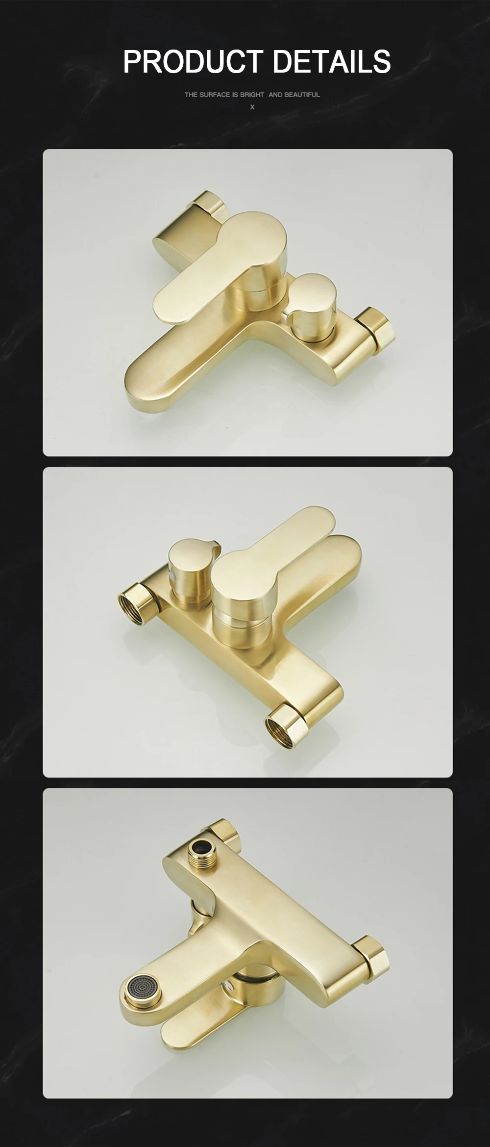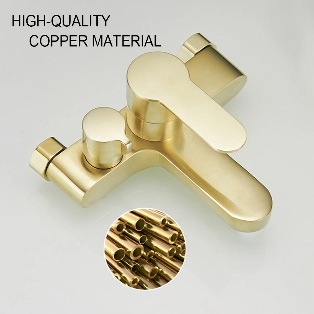 Сведения о продукте: Материал ручного душа: латунь Материал верхней душевой кабины: латунь Смесительный клапан для душа: латунь Душевая горка: латунь Отделка: матовый золотой Ручной душ 1,5 м (59 ")hos Простота установки Расстояние от центра до центра: 13,5-16,5 см (5,3 "-6,6") можно регулировать