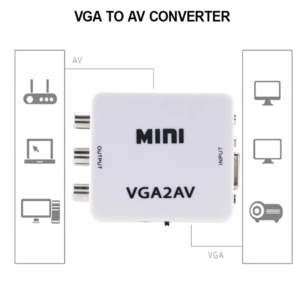 Примечание: Этот преобразователь не двунаправленный. Он преобразует только VGA в AV/RCA. Характеристика: Автоматически обнаруживает и преобразует входные изображения ПК в NTSC, PAL. Поддержка высокого разрешения ввода ПК до SXGA (@ 60 Гц). Разрешение поддержки: 640x480 при 60 fps; 800x600 60 fps, 75 fps; 1024x768 60 fps, 75 fps 1280x720 при 60 fps; 1280x768 60 fps, 75 fps; 1280x1024 60 fps, 75 fps; 1360x768 при 60 fps; 1400x1050 60 fps; 1440x900 60 fps; 1680x1050 при 60 fps; 1600x1200 60 fps; 1920x1080 60 fps; Полоса частот: 165 МГц Входной порт: 1 VGA Выходной порт: 1 RCA /AV Источник питания USB ОУР ЗАЩИТА человеческого тела Модель: +/-8кв (воздушный зазор) +/-КВ (контактный разряд) Рабочая температура: 0 Цельсия ~ 40 Цельсия/32 Фаренгейта ~ 104 Фаренгейта Температура хранения: -20 Цельсия ~ 60 Цельсия/ -4 Фаренгейта ~ 140 Фаренгейта Относительная влажность: 20 ~ 90% относительной влажности (без конденсации) Мощность расход (макс): 2,5 Вт (макс) Вес (г): 80 Цвет: белый Материал: АБС-пластик Посылка: 1 * VGA в AV конвертер 1 * USB кабель