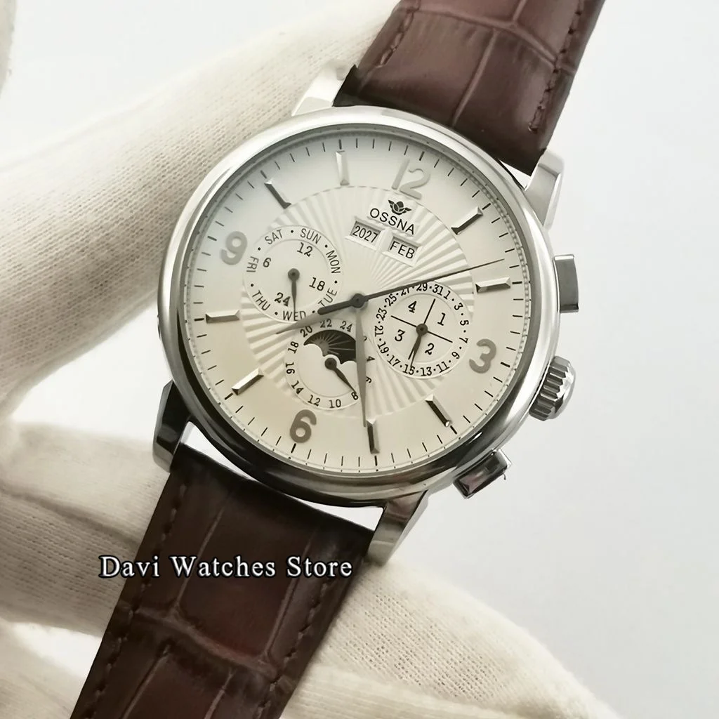 Ossna 42 мм классические роскошные часы для мужчин с белым циферблатом, лунная фаза, кожаные Наручные часы, модные мужские часы с отображением месяца и недели
