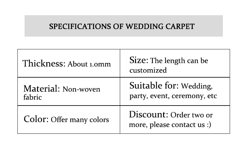 > Ковёр для свадебного прохода изготовлен из высококачественного нетканого материала, безопасный и безвредный. > Он очень прочный и противоскользящий, может использоваться несколько раз. > Подходит для свадьбы в помещении, вечерние и особые случаи, красивые и элегантные, добавляя романтическое чувство к свадьбе.