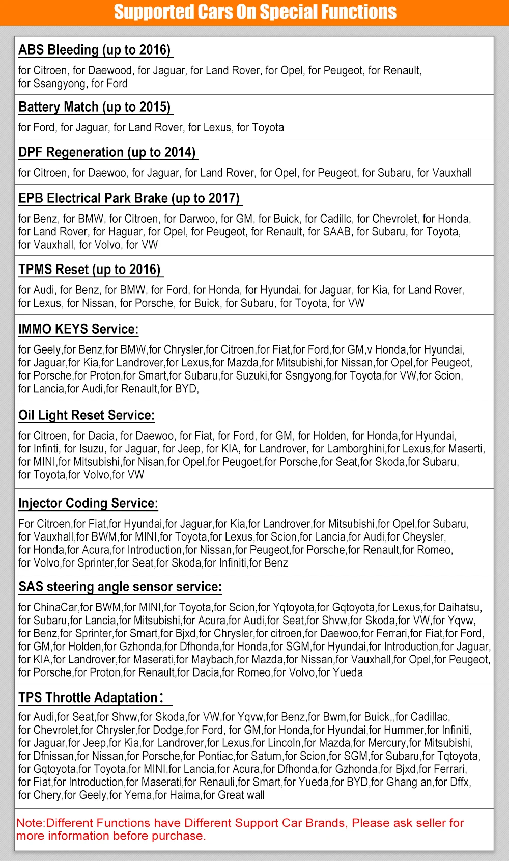 1. Сервис сброса масла: Позволяет выполнить сброс для системы срока службы моторного масла, которая подсчитывает оптимальный интервал изменения срока службы масла в зависимости от условий вождения автомобиля и погоды. 2.EPB сервис: Помогает поддерживать электронную тормозную систему безопасно и эффективно, деактивируя и активируя систему управления тормозом, помогая с контролем тормозной жидкости, открывая и закрывая тормозные колодки, и устанавливая тормоза после замены диска или колодки, И т. д. 3. Давление в АБС ABS тормозное кровотечение, чтобы получить твердую тормозную колодку после изнеможения воздуха. 4.BMS сервис: Позволяет инструменту сканирования оценить состояние заряда батареи, контролировать ток замыкания, зарегистрировать замену батареи и активировать состояние остальной части транспортного средства. 5. Система контроля давления в шинах сервис Имеет значение в отображении идентификационных кодов датчиков от ЭБУ транспортного средства, вводе идентификационных кодов замены датчика TPMS и тестовых датчиков. 6. Служба DPF: Позволяет выполнять множество функций дизельной системы Сажевых фильтров. Услуги TPMS: позволяет быстро просматривать id датчика шин от ЭБУ транспортного средства, а также выполнять Программирование TPMS и процедуры сброса после замены датчиков шин. 7.IMMO сервис: Программирует Новый Противоугонный ключ и выполняет соответствие ключей при замене выключателя зажигания, комбинированной приборной панели, ЭБУ, БСМ или батареи дистанционного управления. 8. Обслуживание датчика угла поворота руля SAS: Помогает очистить память датчика угла поворота руля и играет важную роль в калибровке датчика угла поворота руля. 9. Кодирование инжектора Протекающие инжекторы и некоторые мертвые инжекторы могут быть пропущены, даже если инжектор отключен. Другие проблемы с системой зажигания и механическими компонентами также могут не показать потерю оборотов при выключенном инжекторе 10. Адаптация дроссельной заслонки TPS Корпус дроссельной заслонки представляет собой трубу, содержащую поворотную плоскую (бабочку), которая используется для контроля количества воздуха, входящего в двигатель. В автомобиле с электронным впрыском топлива Датчик положения дроссельной заслонки и датчик расхода воздуха связываются с компьютером, который поставляет необходимое количество топлива на инжекторах. Необходимо переосваивать Положение датчика дроссельной заслонки после очистки или ремонта