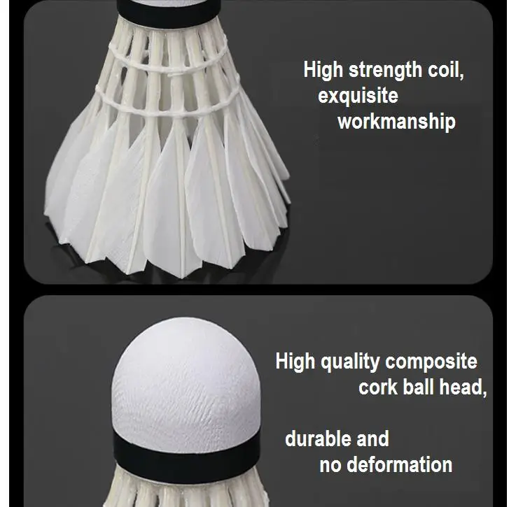 Ball head material: natural cork , Ball skirt material: white duck feather blade feather