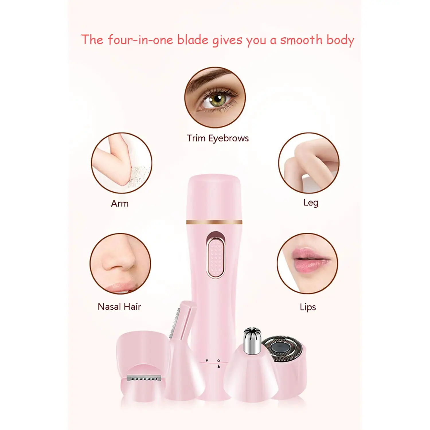4 в 1 многофункциональная электробритва: 4 сменных триммера, включая триммер для волос на теле, триммер для бровей, триммер для волос на носу и триммер для волос на лице, который может удовлетворить все ваши ежедневные потребности. Этот продукт может дать вам удобный гладкий и безболезненный опыт обрезки.