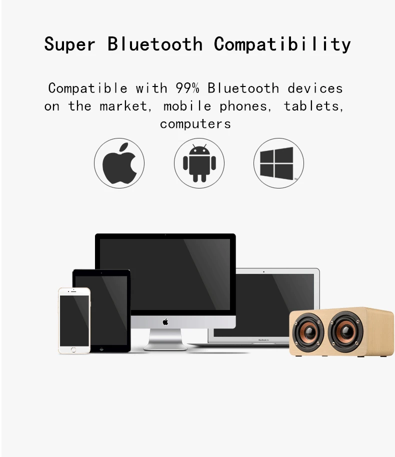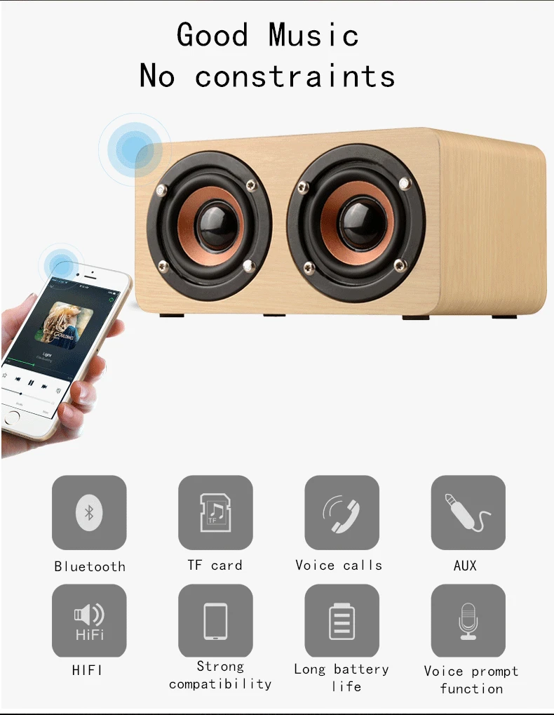 Особенности: 1. Поддержка беспроводного подключения Bluetooth 2. Поддержка воспроизведения tf-карты 3. Поддержка проводного подключения AUX 4. Функция языковой подсказки 5. Функция громкой связи 6. Напоминание об оплате и сборе Параметры материала: 1. Корпус коробки: деревянный корпус коробки 2. Максимальная мощность: 10 Вт 3. Аккумулятор: 1500 мАч 4. Вес брутто продукта: 600 г 5. Размер динамика: W150 * D85 * h75мм 6. Проводка: 1 micro USB кабель для зарядки