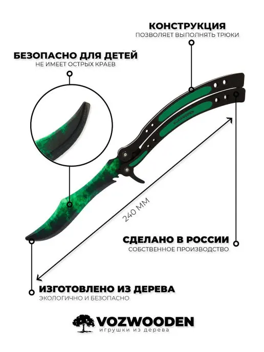 Наши ножи выполнены из настоящего дерева, экологически чистых материалов. Оружие имеет максимальную детализацию и очень похоже на настоящее, но в своем безопасном варианте. Качество нашей печати позволяет делать идеально насыщенные и стойкие цвета.