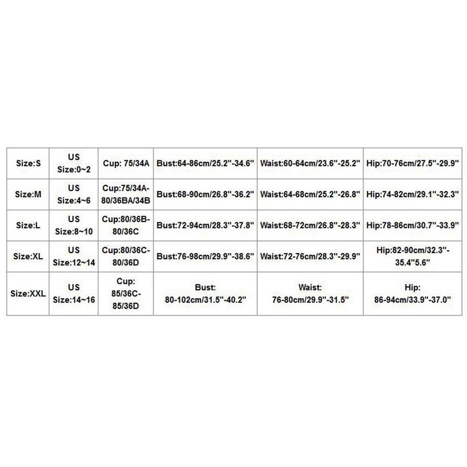 Size US UK EU Bust Waist Hip S 4 8 34 64-86cm/25.20''-33.86'' 60-64cm/23.62''-25.20'' 70-76cm/27.56''-29.92'' M 6 10 36 68-90cm/26.77''-35.43'' 64-68cm/25.20''-26.77'' 74-82cm/29.13''-32.28'' L 8 12 38 72-94cm/28.35''-37.01'' 68-72cm/26.77''-28.35'' 78-86cm/30.71''-33.86'' XL 10 14 40 76-98cm/29.92''-38.58'' 72-76cm/28.35''-9.92'' 82-90cm/32.28''-35.43'' XXL 12 16 42 80-102cm/31.50''-40.16'' 76-80cm/29.92''-31.50'' 86-94cm/33.86''-37.01''