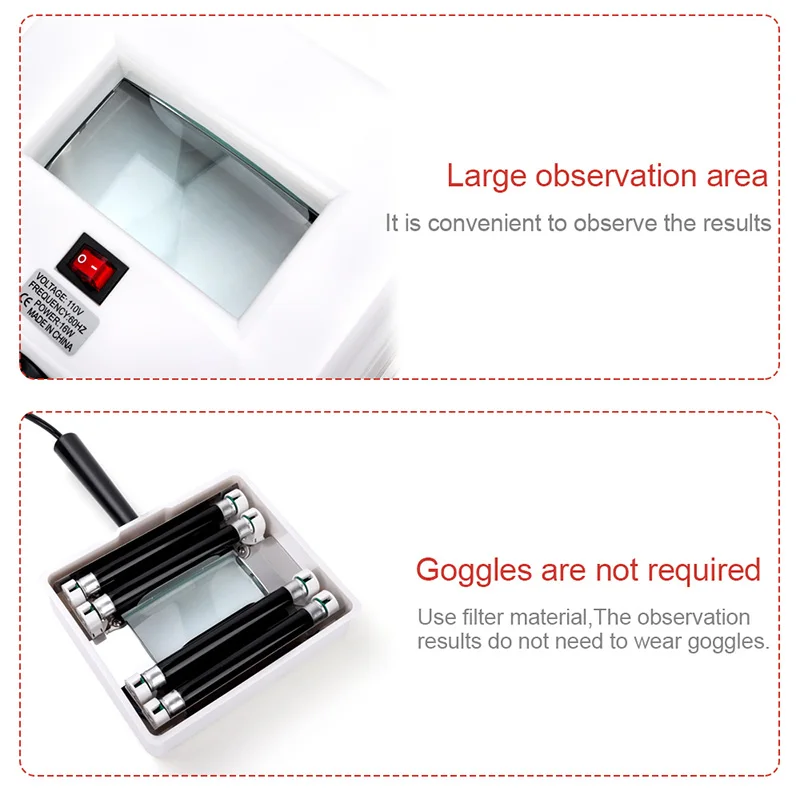 * Деревянная лампа помогает четко определить качества, проблемы и необычные условия кожи, для того, чтобы обеспечить правильное лечение, изучить различные кожи, типы или частицы кожи и условия, обнаруживает дефекты кожи, которые обычно невидимы для глаз. Позволяет эстетику проводить план лечения для правильного лица.