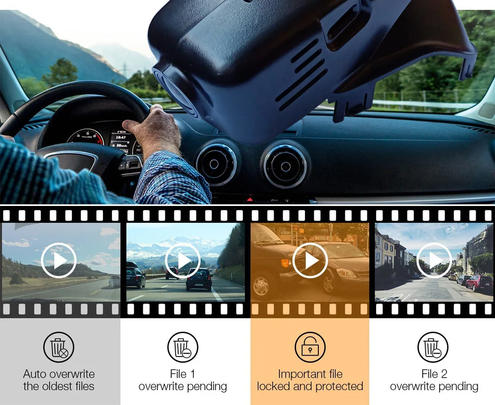 Циклическая запись без утечки секунд сегментация видеоЗапись, когда видео будет полным, регистратор будет автоматическиУдалите ранее Записанные видеоклипы и запишите их вПетля, так что вам не придется беспокоиться о частых смене карты.
