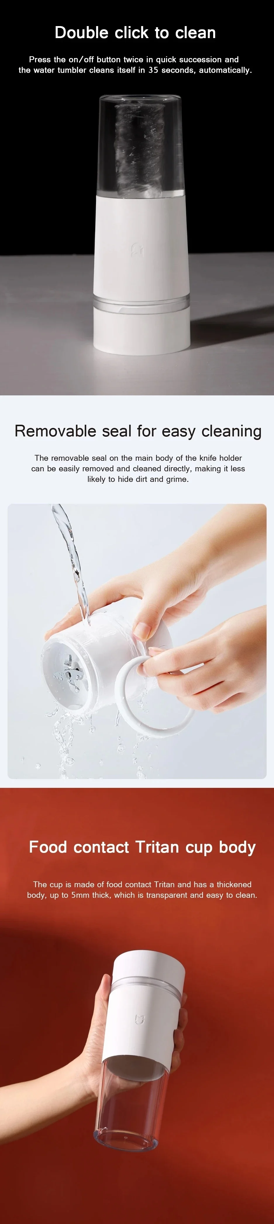 -Дважды нажмите, чтобы очистить: Нажмите кнопку ВКЛ/ВЫКЛ дважды быстро и стакан воды очищает себя в течение 35 секунд, автоматически.