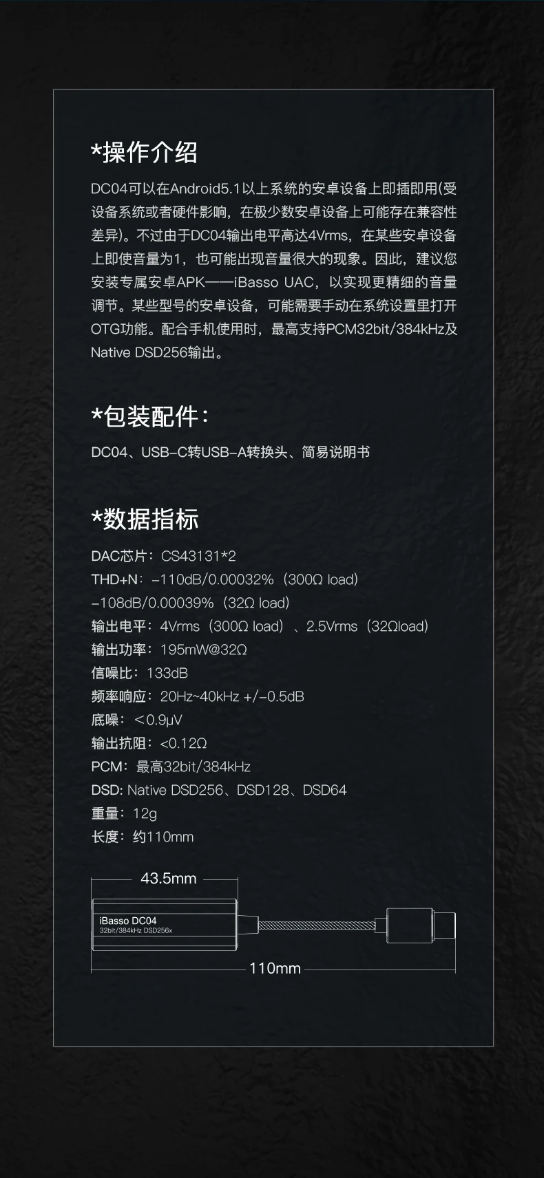 Чип indexDAC данных: CS43131 * 2THD + N: -1 10 дБ/0.00032% (нагрузка 300Q)-108дб/0.00039% (нагрузка 32Q)