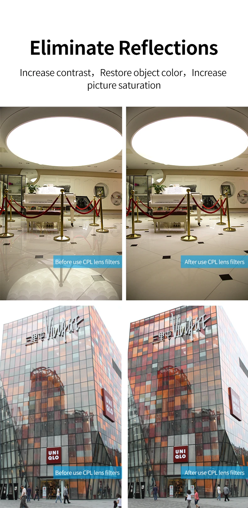 1.Polarizing filter eliminates reflections from non-metallic surfaces, and increases contrast and color saturation.