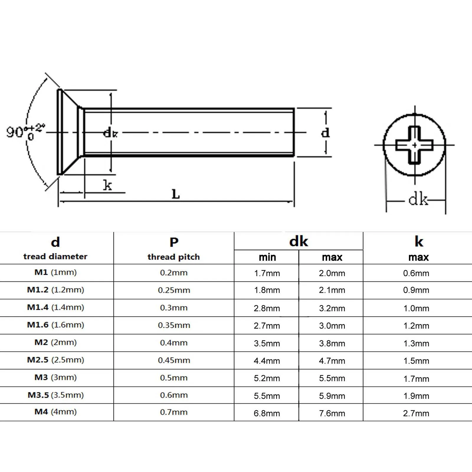 0,4 мм (M2) /0,45 мм (M2.5) /0,5 мм (M3) /0,6 мм (M3.5) /0,7 мм (M4)