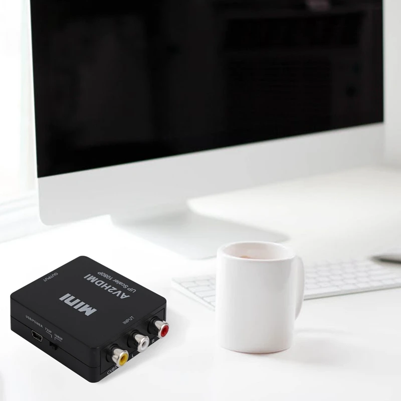 [Мини Размер] Очень маленький RCA в HDMI конвертер коробка, портативный и гибкий, небольшой нагрев, стабильность работы. [Внимание] Подключите usb-кабель к настенному зарядному устройству 5 В/1 А. Если кабель USB подключен к AV оборудованию, это может привести к плохой источник питания