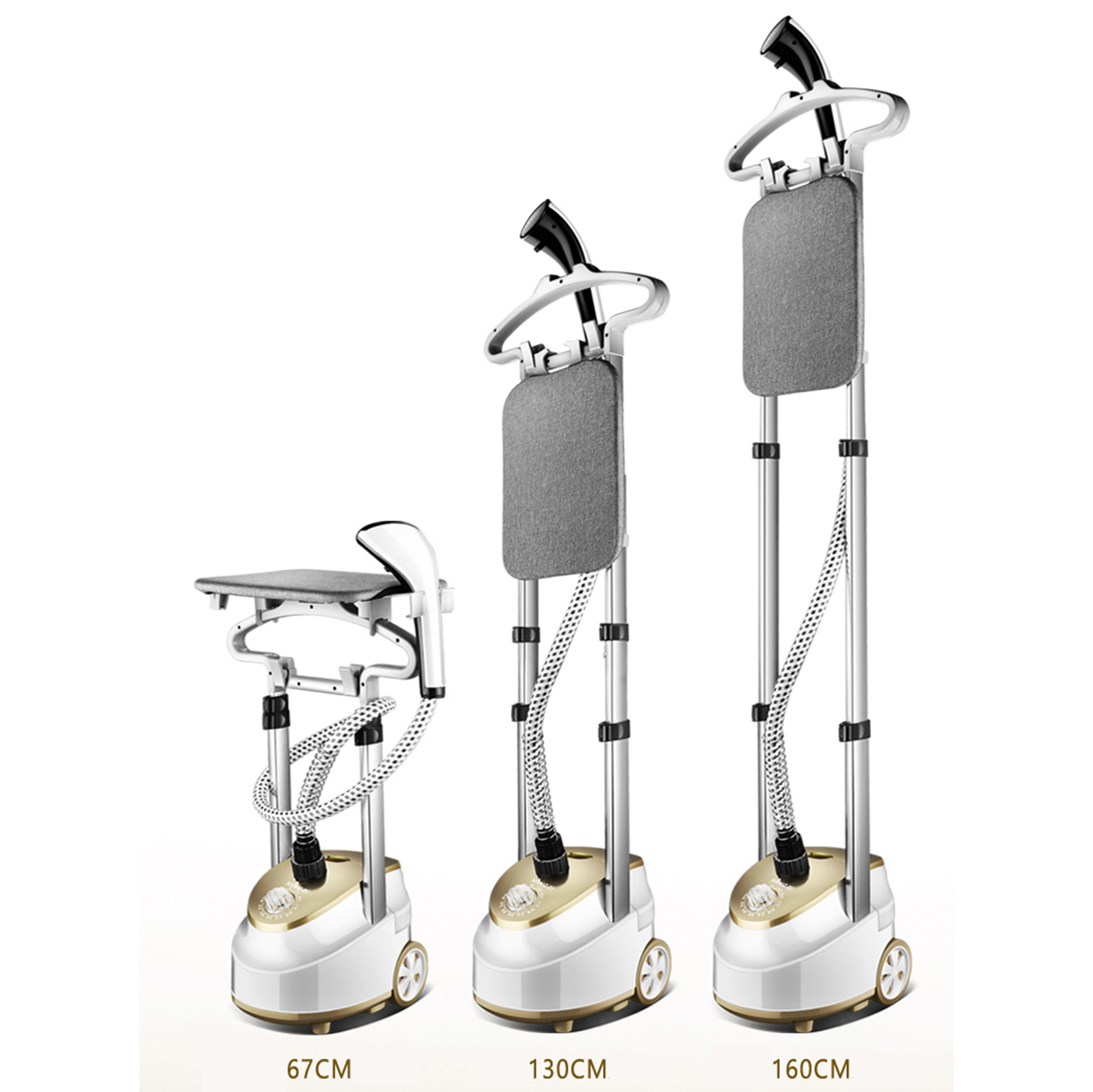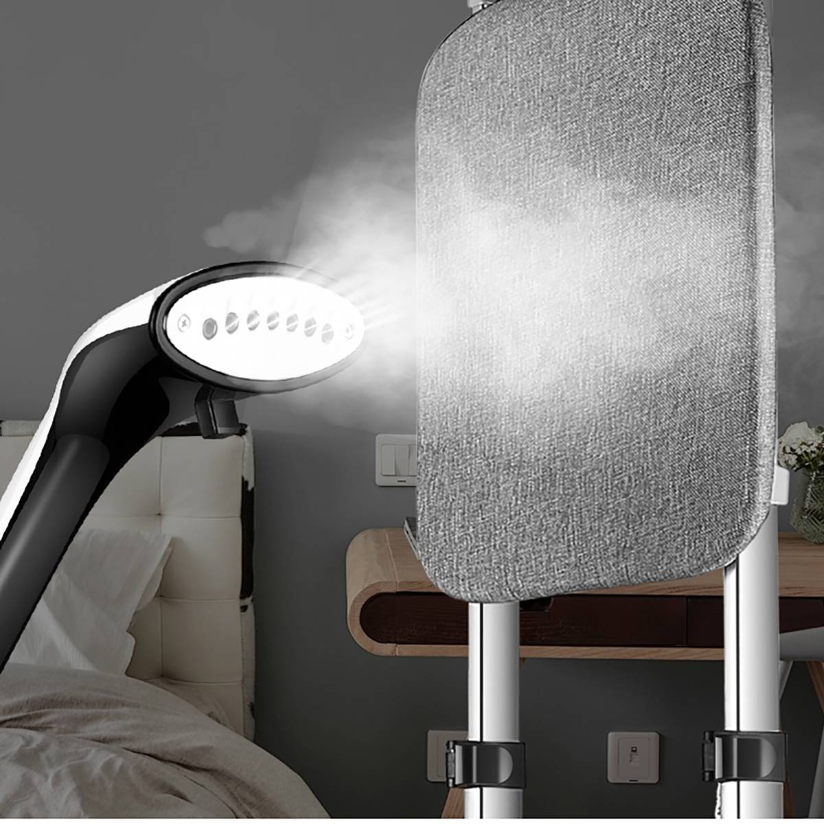 Встроенная гладильная доска и регулируемые шесты: встроенная гладильная доска может быть отрегулирована под любым углом, подходит для вертикального парения и горизонтальной глажки. Телескопические палки регулируются для удобства использования и сползают для хранения, в то время как встроенная вешалка для одежды и брюки нажмите зажим с тканевой щеткой держит одежду в положении во время парения.