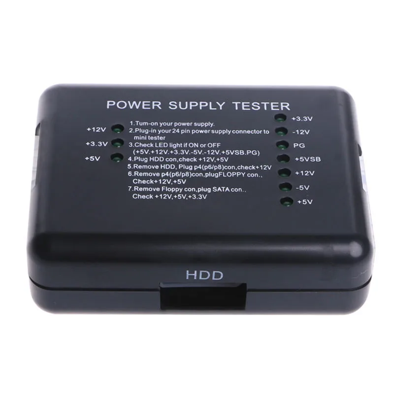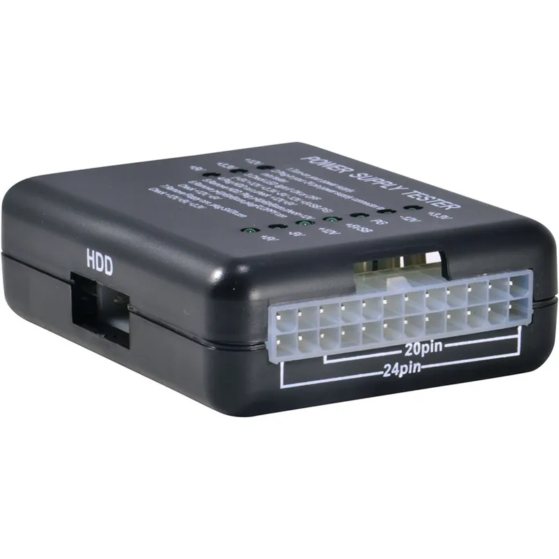 Checks 20/24-pin ATX (motherboard) power, SATA (hard drive) power, Molex (old hard drive) power, Mini-molex (floppy) power, and 6-pin PCI-e (graphics card) connectors.