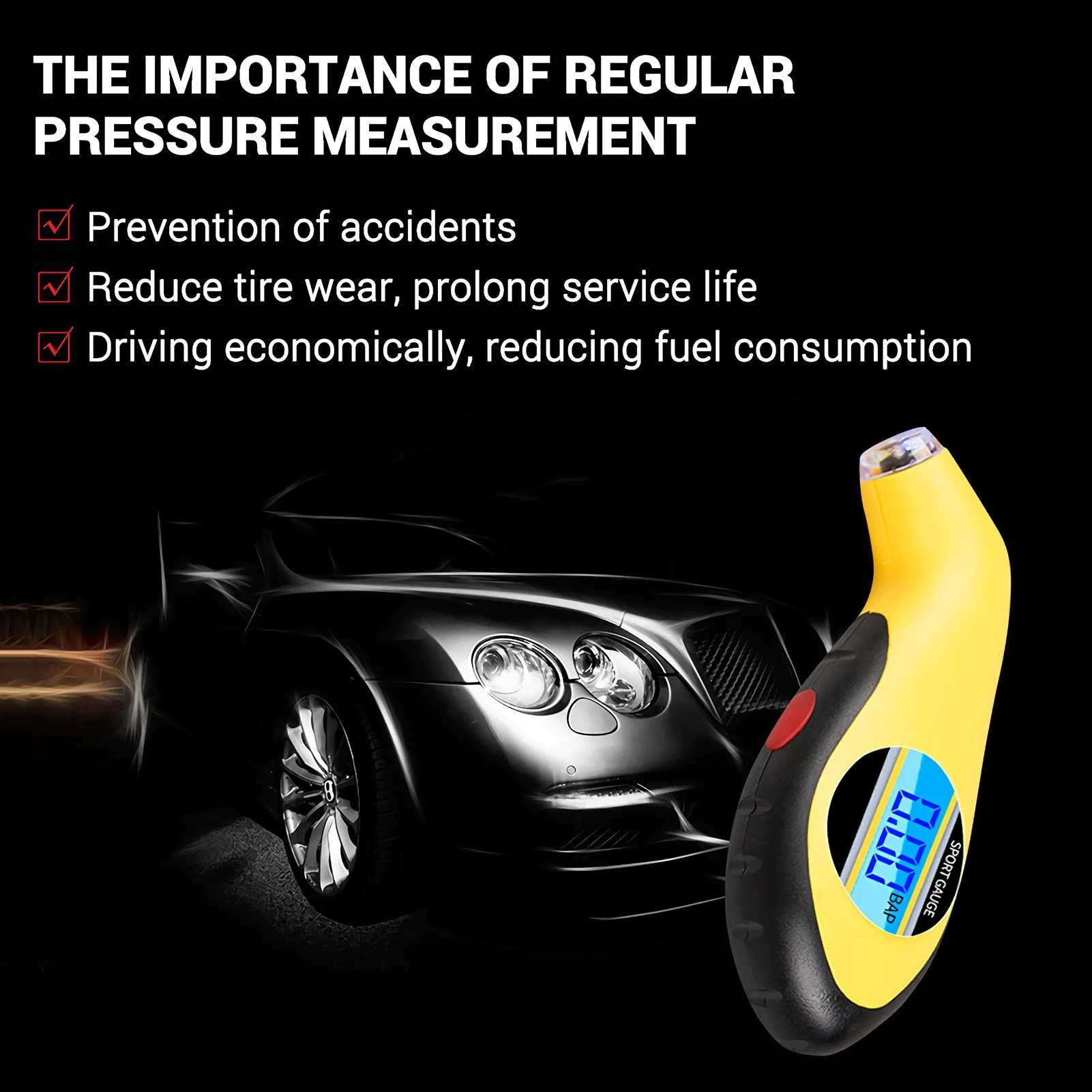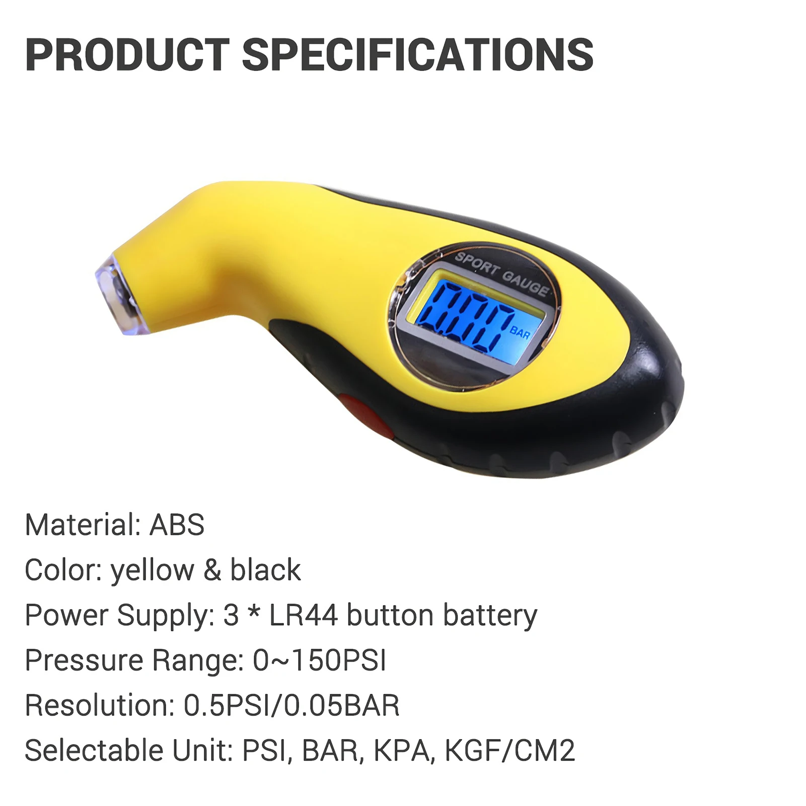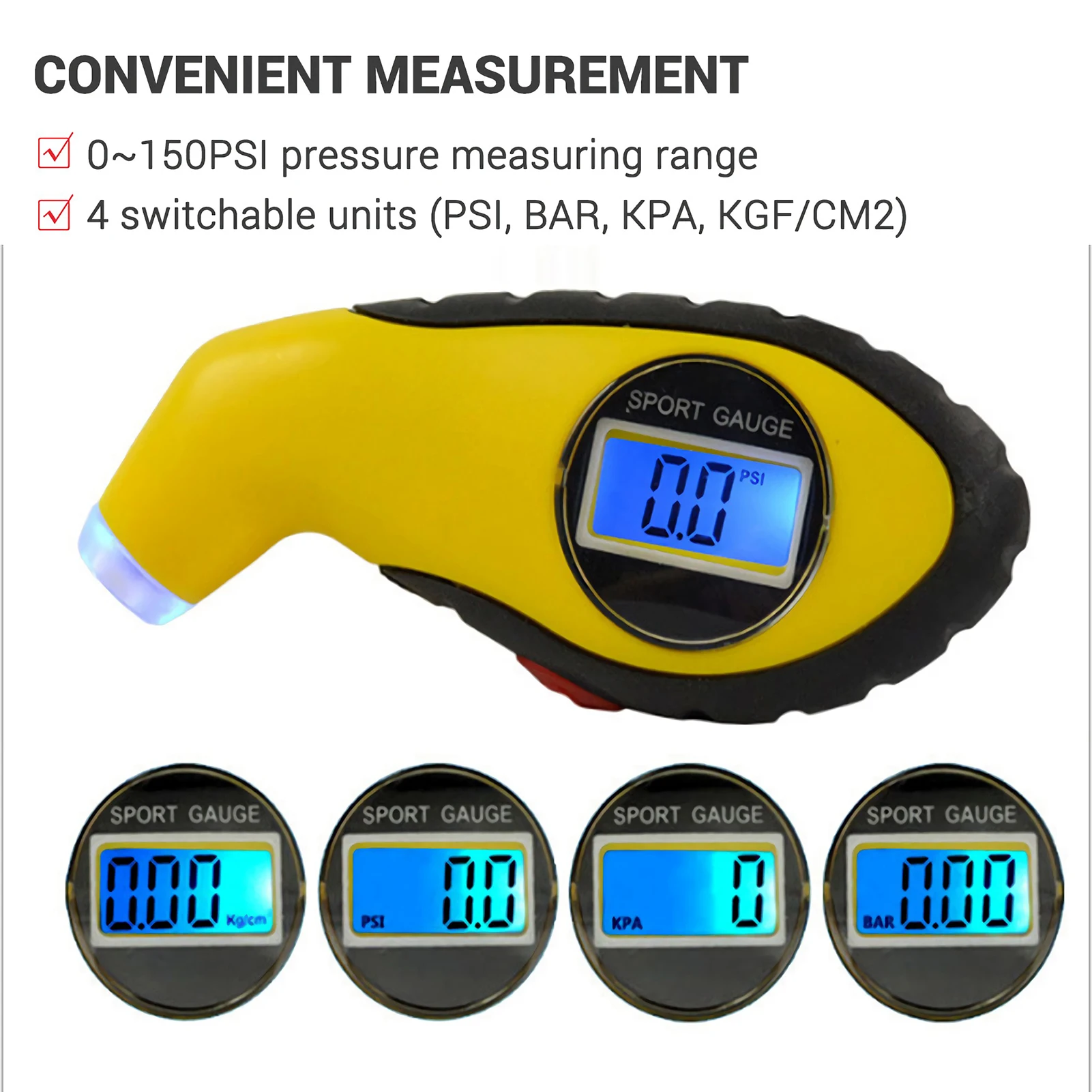 -Диапазон измерения давления 0 ~ 150PSI и 4 переключаемых блока (PSI, BAR, KPA, KGF/CM2) для удобного измерения.