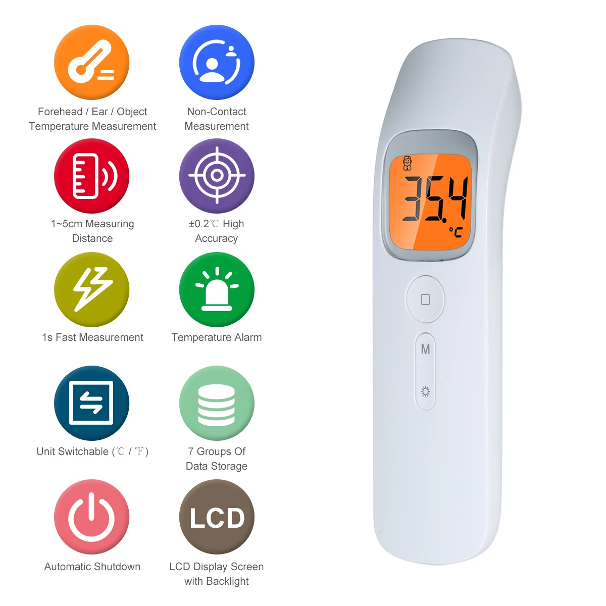 Благодаря передовой инфракрасной технологии этот портативный инфракрасный термометр может обеспечить быстрое и точное измерение температуры без контакта в течение одной секунды, эффективно защищая вас от перекрестной инфекции, вызванной традиционным измерением температуры тела. Хороший продукт, который вы не пропустите! Особенности: [Бесконтактное измерение] используется для измерения температуры лба или уха на расстоянии 1-5 см без прямого контакта с кожей человека, предотвращая перекрестную инфекцию и делая измерение более безопасным. [Несколько режимов] Измерение температуры лба и температуры уха и температуры объекта. [Высокая точность и 1s Быстрое измерение] усовершенствованный инфракрасная система обнаружения и высокоточными датчиками обеспечивают высокую точность (± 0,2 ℃) и мгновенный результат (≤ 1s). [Переключение устройства] свободный обмен температурных единиц (℃ / ℉). В режиме выключения удерживайте клавишу памяти около 6 секунд, пока не отобразится ℃/℉. После автоматического отключения, перезагрузите счетчик и установка будет успешной. [Температурная сигнализация] температура сигнализации может быть установлена свободно, легко работать. [Хранение данных] хранение 7 групп данных измерений для анализа и справки. [ЖК-дисплей Экран] ясный 3 цифр ЖК-дисплей дисплей Экран с подсветкой, легко читать результатов измерений даже в соответствии с тусклой среде. [Автоматическое выключение] Автоматическое выключение питания, если нет работы в течение 8 секунд, эффективное энергосбережение. [Прочного Питание] питание от батарей 2 * AAA 1,5 V батарея (не входит в комплект поставки), низкая потребеление энергии в течение примерно 20000 раз, что измерения были сделаны вручную. Характеристики: Материал: АБС + электронные компоненты Цвет: белый Питание: 2 * AAA 1,5 V батарея (не входит в комплект) Диапазон измерения: Режим лба: 32,0 ℃ ~ 42,9 ℃/89,6 ℉ ~ 109,2 ℉ Режим объекта: 0,0 ℃ ~ 93,0 ℃/32,0 ℉ ~ 199,4 ℉ Точность: ± 0,2 ℃ / ± 0,4 ℉ Разрешение: 0,1 ℃/0,1 ℉ Автоматическое выключение: около 8 с Размер изделия: прибл. 15*4*3 см/5,91*1,57 * 1.18in Вес изделия: прибл. 56 г/1,98 унций Размер посылка: прибл. 15,5*4,6*3,5 см/6,1*1,81 * 1.38in Вес посылка: прибл. 70 г/2,47 унций Упаковочный лист: 1 * термометр 1 * Руководство пользователя (на английском языке)