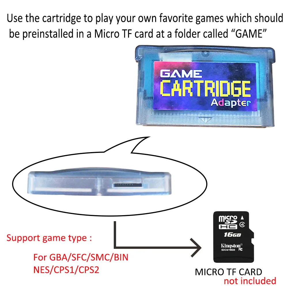 Мини-Консоль имеет слот картриджа. Используется для адаптера sd-карты. Не игровой картридж. Адаптер sd-карты мы отправим с помощью консоли. Вы можете загрузить больше игр из Интернета, а затем поместить их в sd-карту. После этого поместите sd-карту в адаптер, который может играть в дополнительные игры на нашей мини-портативной игровой консоли.