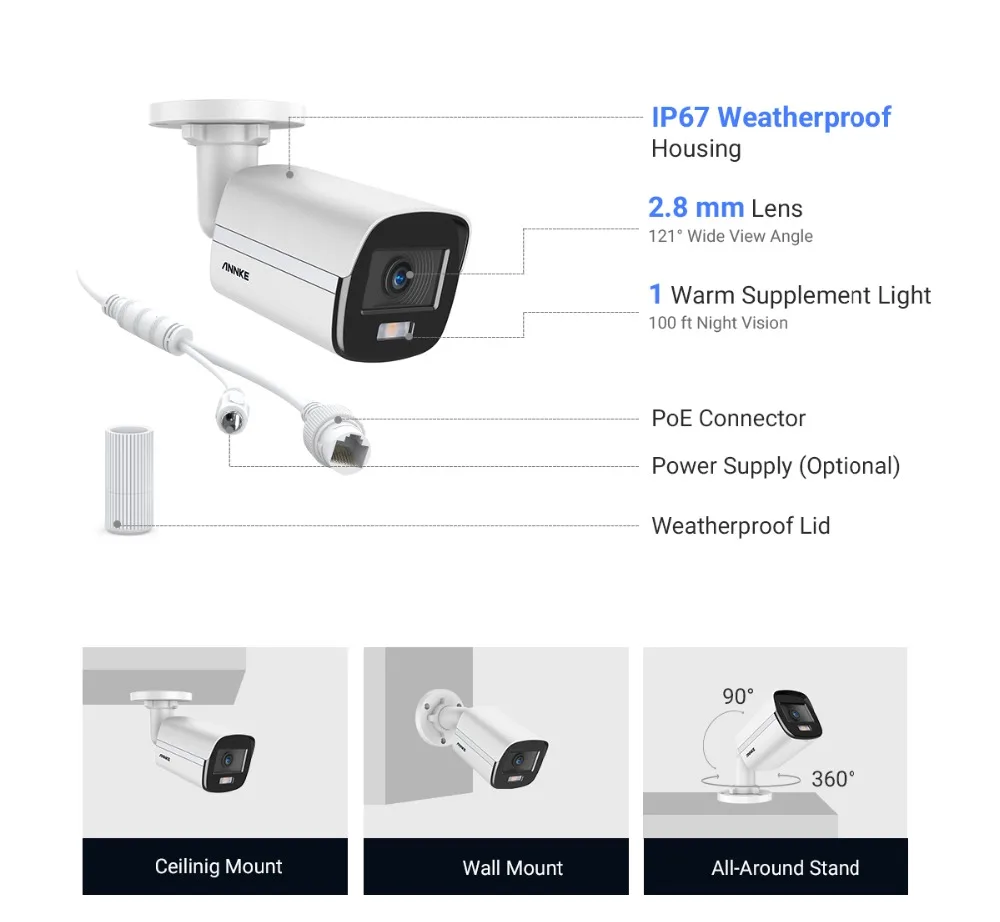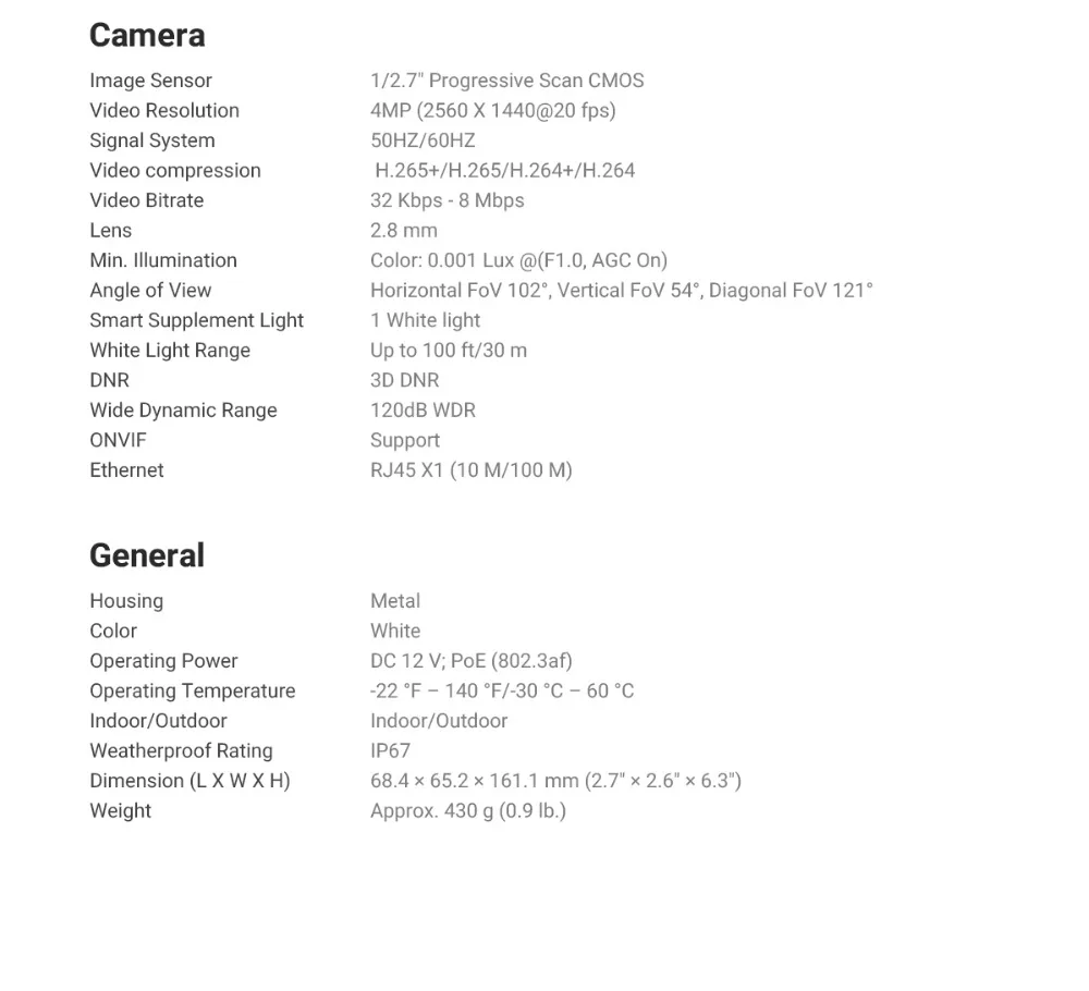 Характеристики камеры:Датчик изображения: 1/2.7 "Прогрессивное сканирование CMOSРазрешение видео: 4 МП (2560X1440 @ 20 кадров в секунду)Сигнальная система: 50 Гц/60 ГцСжатие видео: H.265 +/H.265/H.264 +/H.264Битрейт видео: 32 кбит/с-8 Мбит/сОбъектив: 2,8 ммМин. Освещение: Цвет: 0,001 Люкс @(F1.0, AGC On)Угол обзора: горизонтальный FoV 102 °, вертикальный FoV 54 °, диагональ FoV 121 °Умный дополнительный светильник: 1 белый светильникБелый светильник: до 100 футов/30 мDNR:3D DNRШирокий динамический диапазон: 120 дБ WDRONVIF: ПоддержкаEthernet:RJ45 X1 (10 м/100 м)Корпус: металлЦвет: белыйРабочая мощность: 12 В постоянного тока; PoE (802.3af)Рабочая температура:-22 °F - 140 °F/-30 °C - 60 °CВнутренний/наружный: Внутренний/наружныйСтепень защиты от атмосферных воздействий: IP67Размер (Д X Ш X В): 68,4 × 65,2 × 161,1 мм (2,7 "× 2,6" × 6,3 ")Вес: прибл. 430 г (0,9 фунтов).