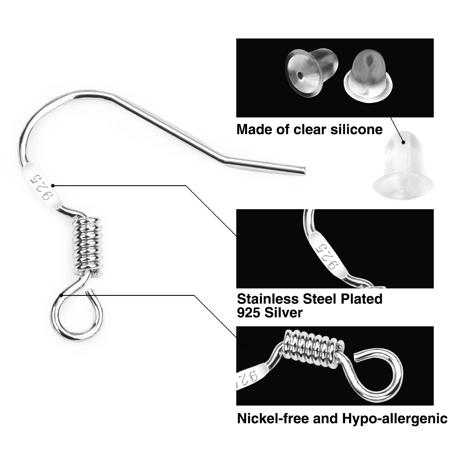 Материал: крючок для сережек-серебро 925 пробы, затычки для ушей-силикон, кольцо для прыжков-нержавеющая сталь