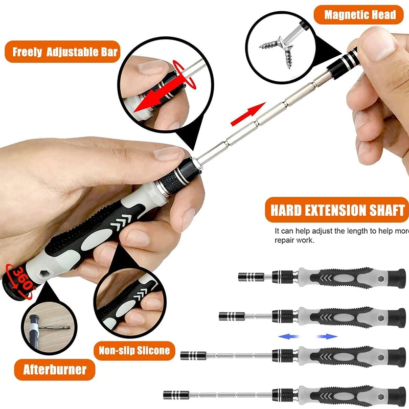 [Гибкий вал и эргономичная Нескользящая ручка] ручка отвертки имеет нескользящий эргономичный дизайн, который поможет вам легко захватывать его, не скользит. Набор Магнитных отверток оснащен жестким удлинительным валом и гибким удлинительным валом, регулируемым длиной до 117 мм, который легко растягивается до узкого места, где ручка не может войти. Набор Магнитных отверток помогает вам гибко и точно закончить ремонтные работы.