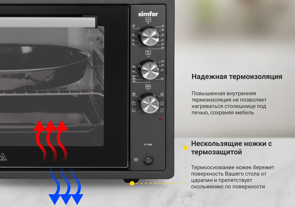 К числу немаловажных достоинства настольной духовки М7006 следует отнести такие: