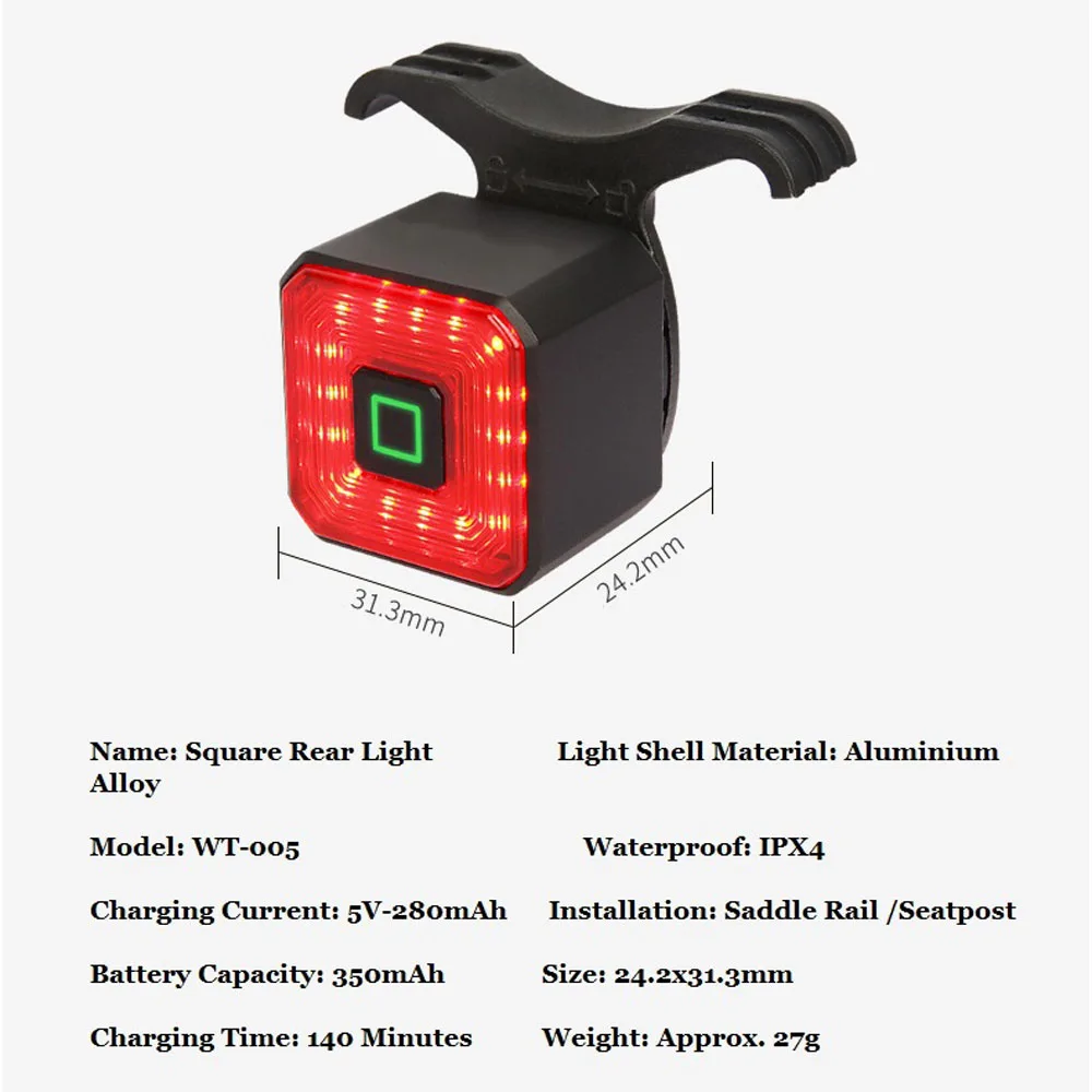 Auto/Manual ModeAutomatically turn on/off depending on the light intensity, braking and motion, Automatically switch to sleep mode to save power, Press the button turn the cycling taillight on, then press button twice to change the different mode(auto sign turn on green light,auto mode open).