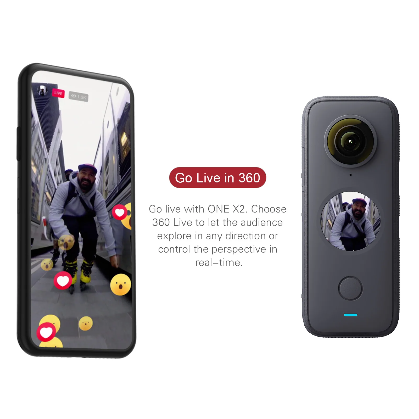 Время невидимой пули:С невидимой селфи-палкой (не входит в комплект) для полной записи видео на 360 °, подключите селфи-палку с помощью ручки Insta360 bullet time (не входит в комплект), чтобы изучить изображение третьего лица.