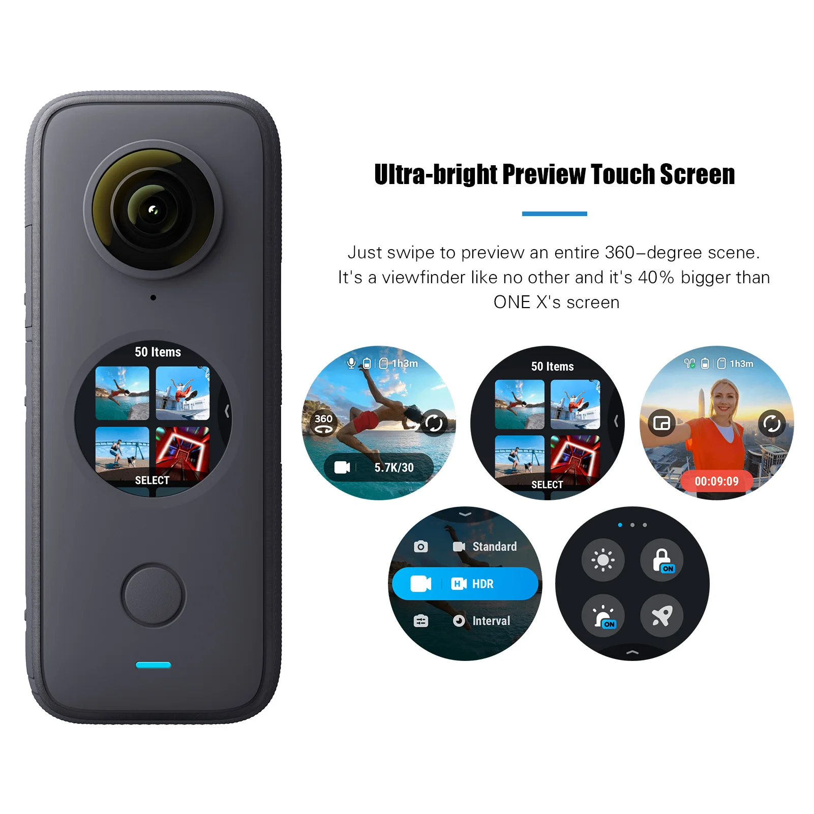 5,7 K 30 кадров в секунду видео и фото:360 ° панорамный и широкоугольный 5,7 K @ 30fps видео и 6080x3040 фото доступны, с сенсорной круглый ЖК-дисплей экран для просмотра и легкая работа.