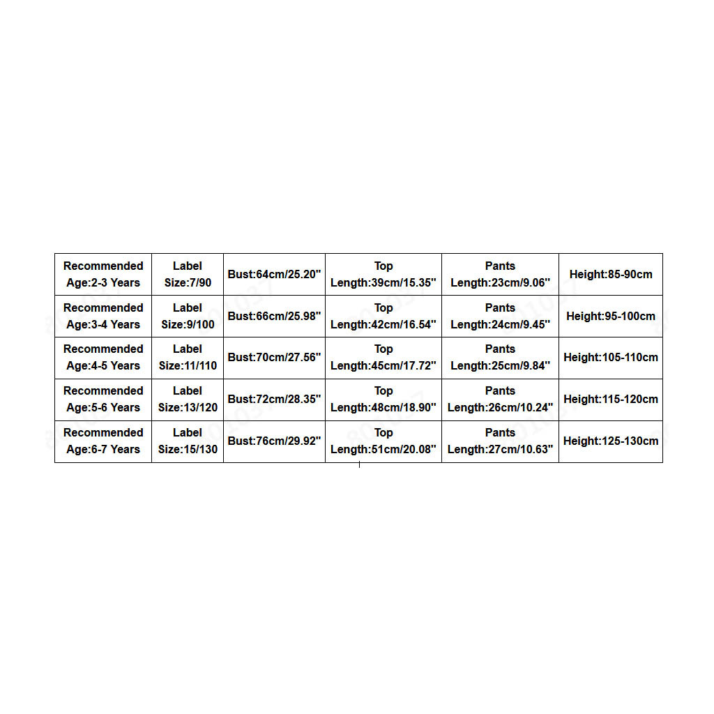 Рекомендуемый возраст Размер этикетки Бюст Длина верха Длина брюк Высота От 2 до 3 лет 7/90 64 см/25,20'' 39 см/15,35'' 23 см/9,06'' 85-90 см От 3 до 4 лет 9/100 66 см/25,98'' 42 см/16,54'' 24 см/9,45'' 95-100 см От 4 до 5 лет 11/110 70 см/27,56'' 45 см/17,72'' 25 см/9,84'' 105-110 см От 5 до 6 лет 13/120 72 см/28,35'' 48 см/18,90'' 26 см/10,24'' 115-120 см От 6 до 7 лет 15/130 76 см/29,92'' 51 см/20,08'' 27 см/10,63'' 125-130 см