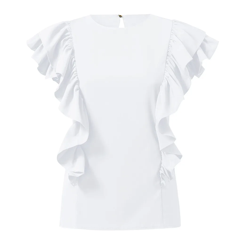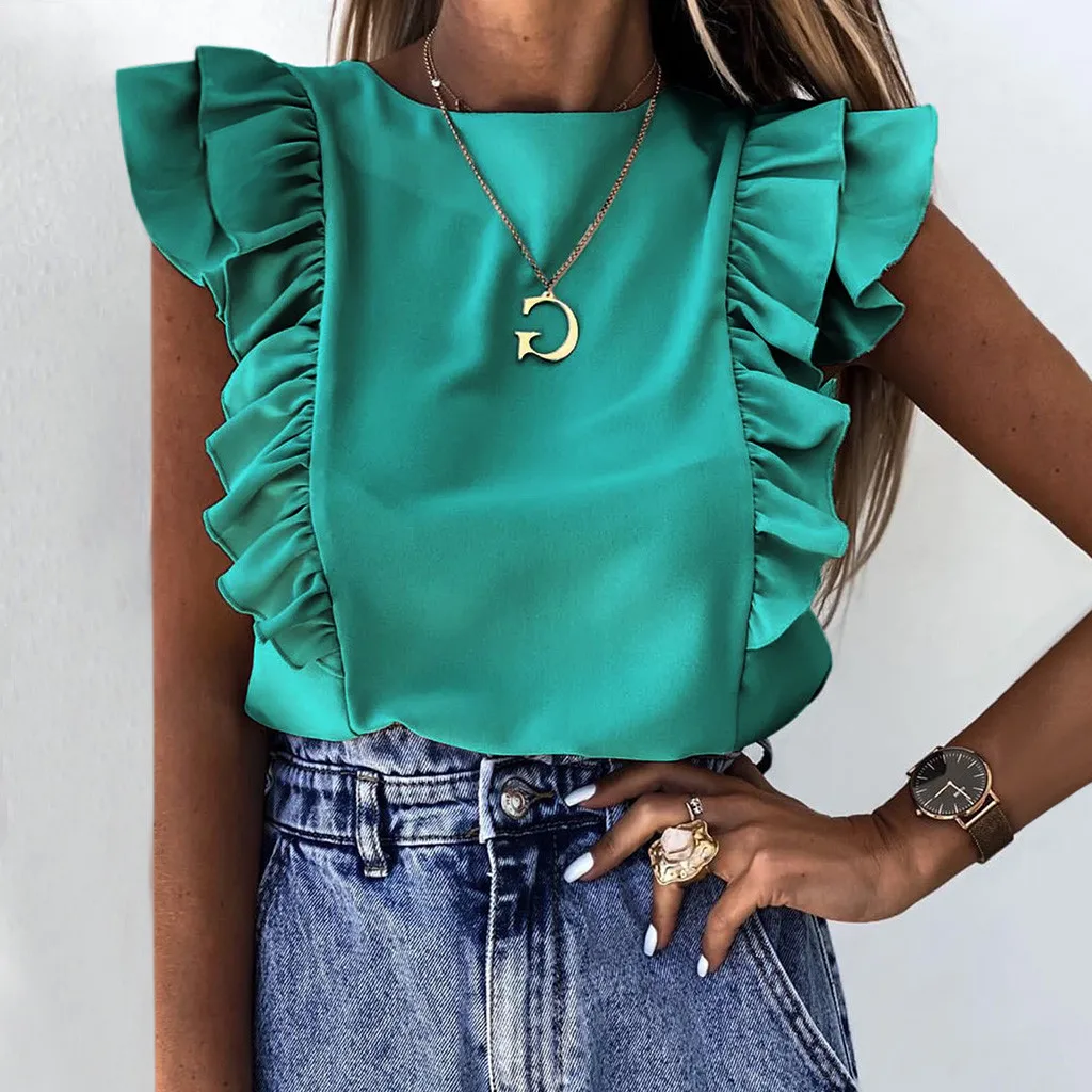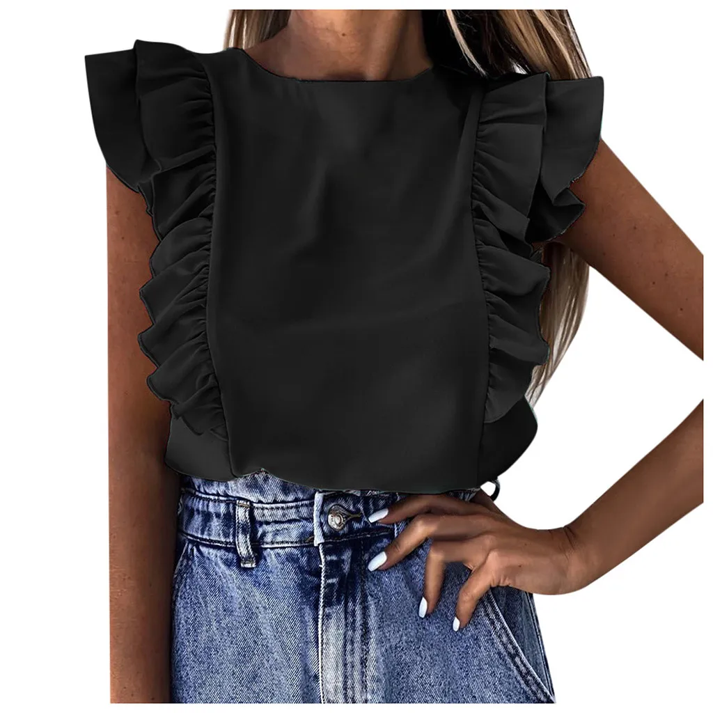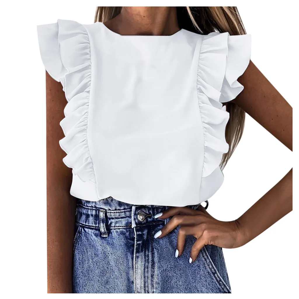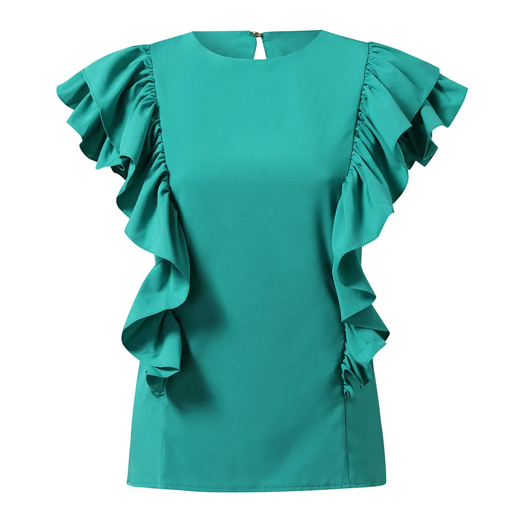 Модная женская блузка-туника с рюшами и коротким рукавом, с круглым вырезом, праздничные простые футболки