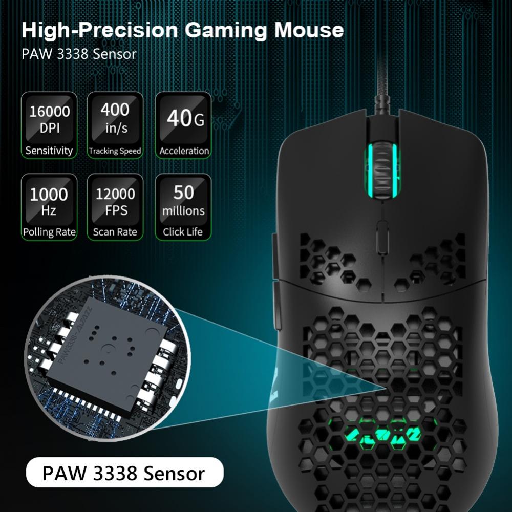 Он использует специальное программное обеспечение и технологию оптического датчика PAW3338, и срок службы его кнопки составляет 50 миллионов раз.