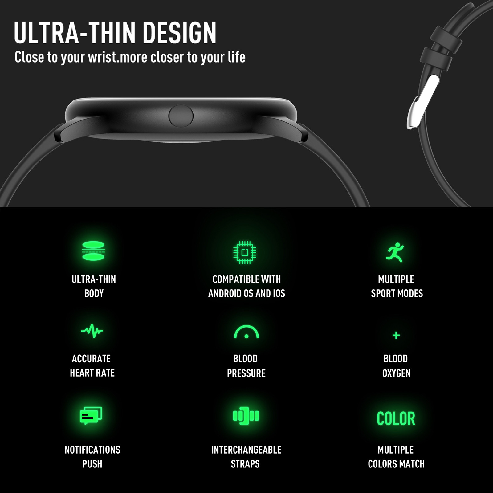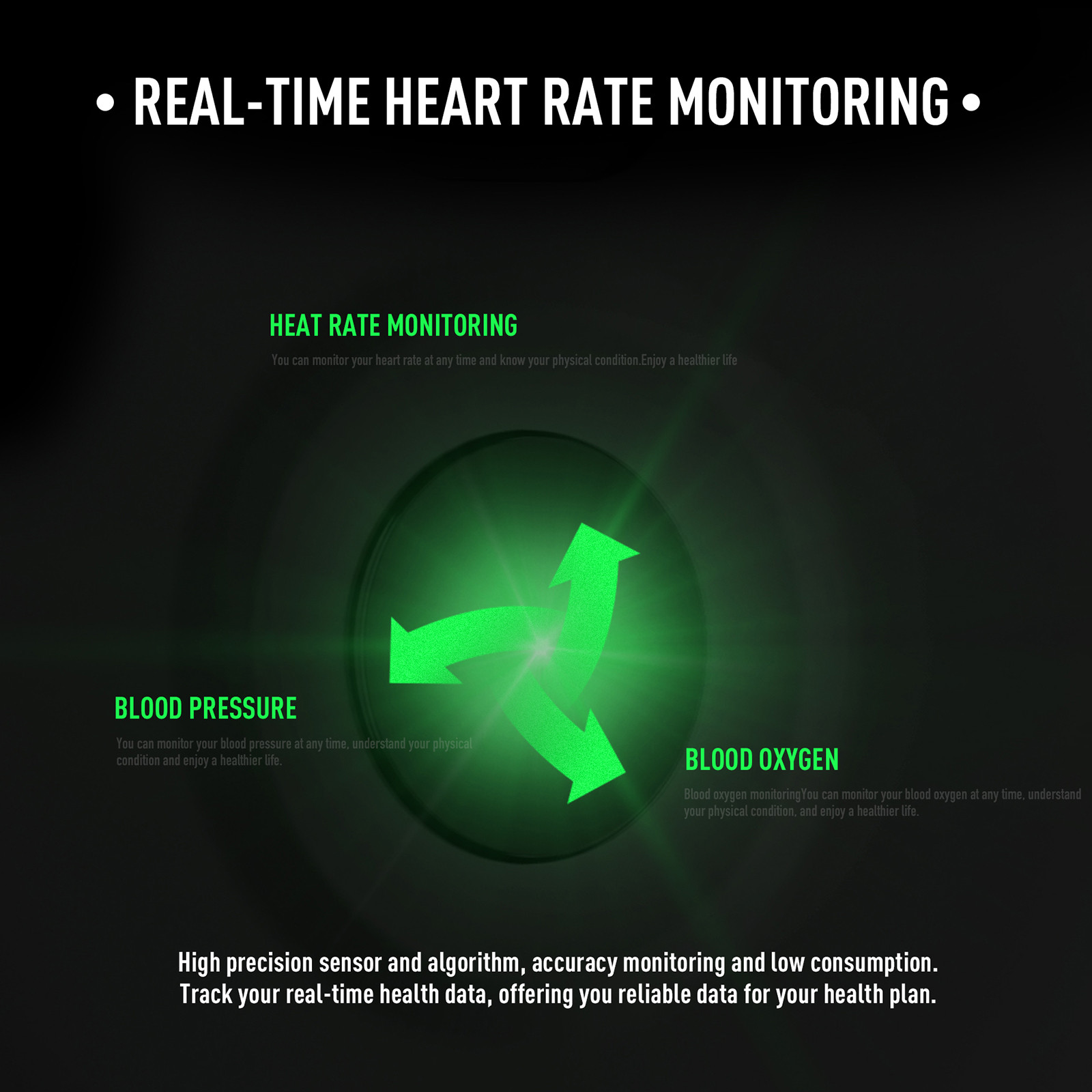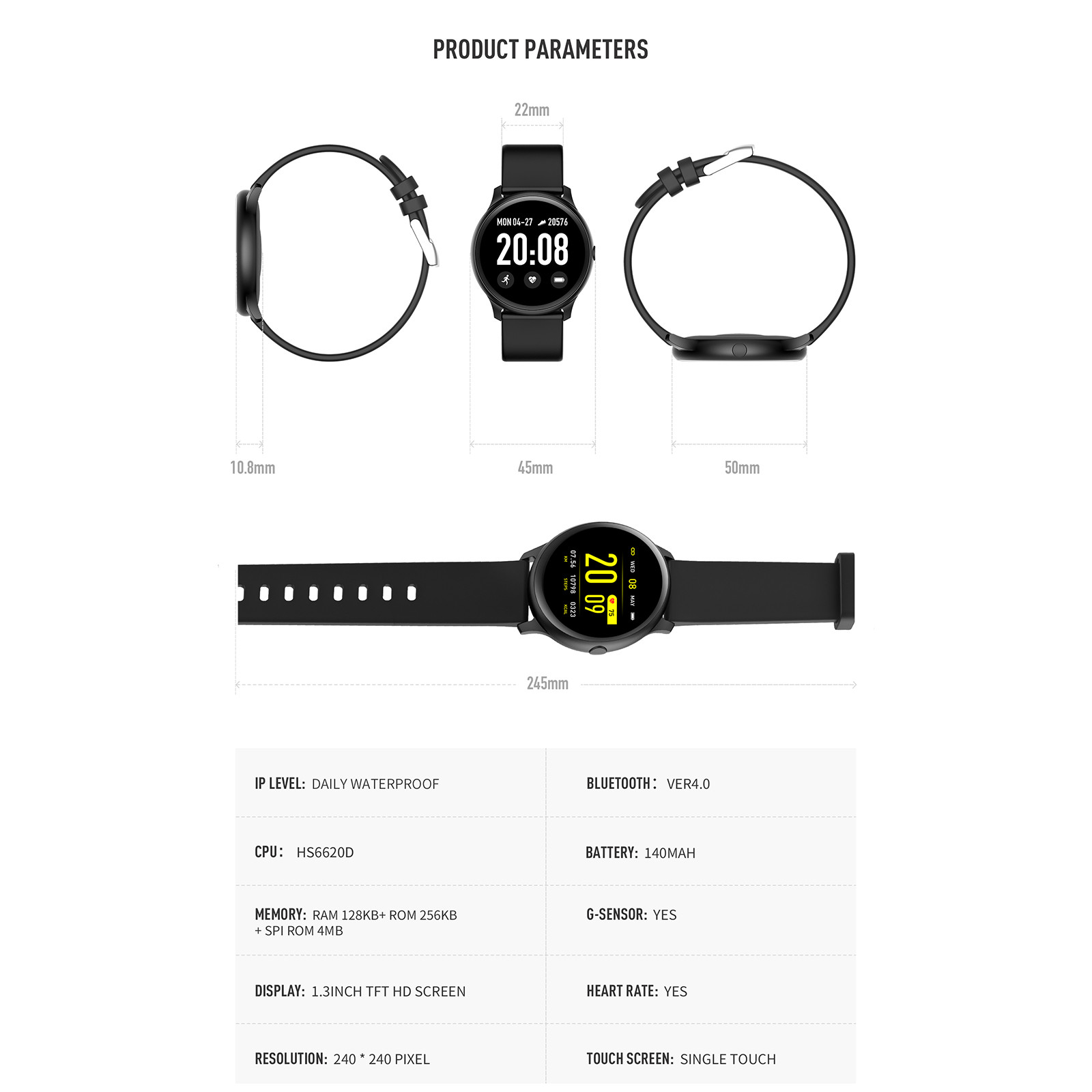 1,3 дюймовый круглый TFT HD Экран 1,3 дюйма высокое разрешение Круглый полный-СенсорныйЭкран делает отображаемое содержимое более ярким и Красивый. Больший экран, по ширине запястья, приятный Ощущение ношения. Пульс в реальном времени Монитор/монитор артериального давления/Монитор кислорода в крови Он может точно контролировать Импульсы и активные и отдыхающие изменения частоты сердечных сокращений для создания Профессиональный отчет о пульсе. Поддержка монитора артериального давления и крови Кислородный монитор (не Профессиональный-Медицинский Оборудование, данные о кровяном давлении приведены только в качестве справки). Монитор сна Отслеживает ваш сон Качество за счет измерения продолжительности для глубокого сна, без быстрого сна и Состояние бодрствования. Несколько спортивных режимов Имеет 7 спортивных режимов: Бег, прогулки, футбол, прыжки, бадминтон, баскетбол, езда на велосипеде. Он имеет Функции шагомера, расстояния, калорий, секундомера. IP67 водонепроницаемый С ним легко справиться Ежедневная гидроизоляция (нельзя плавать или контактировать с горячей водой, подходит для Нормальная холодная вода). Оборудование Чипсет HS6620D Память RAM 128 Кб + ROM 256 Кб + SPI 4 Мб -СенсорныйСенсорный экран Синголо Дисплей TFT da 1,3 Pollici; risoluzione : 240*240 пикселейПосылка