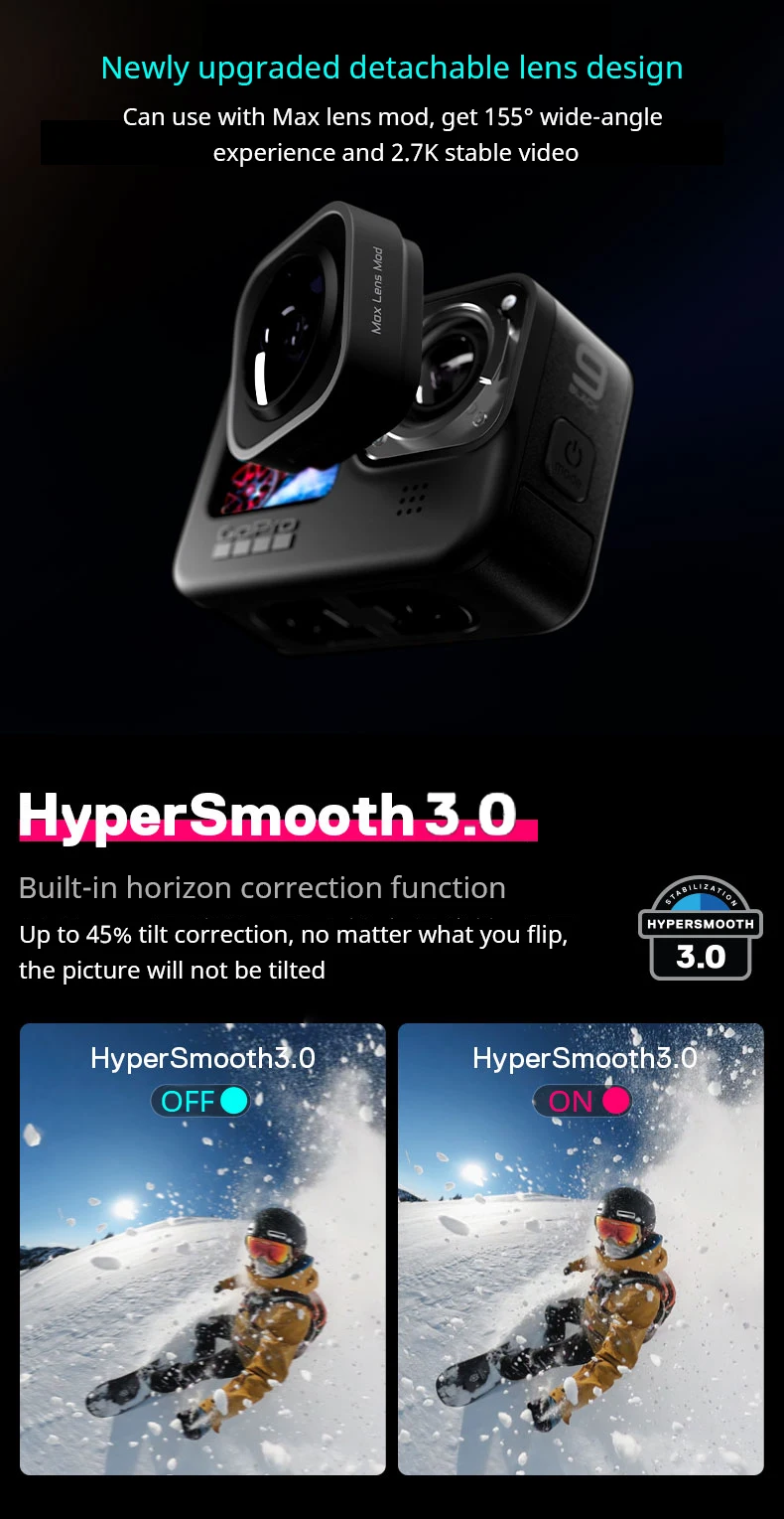 Испытайте максимальную гладкость с нашей самой передовой стабилизацией видео когда-либо. Hypermooth 3,0 обеспечивает выравнивание горизонта в камере и увеличение во всех настройках.