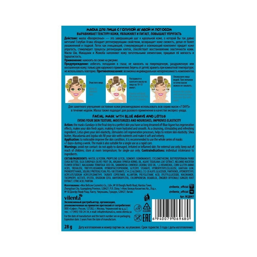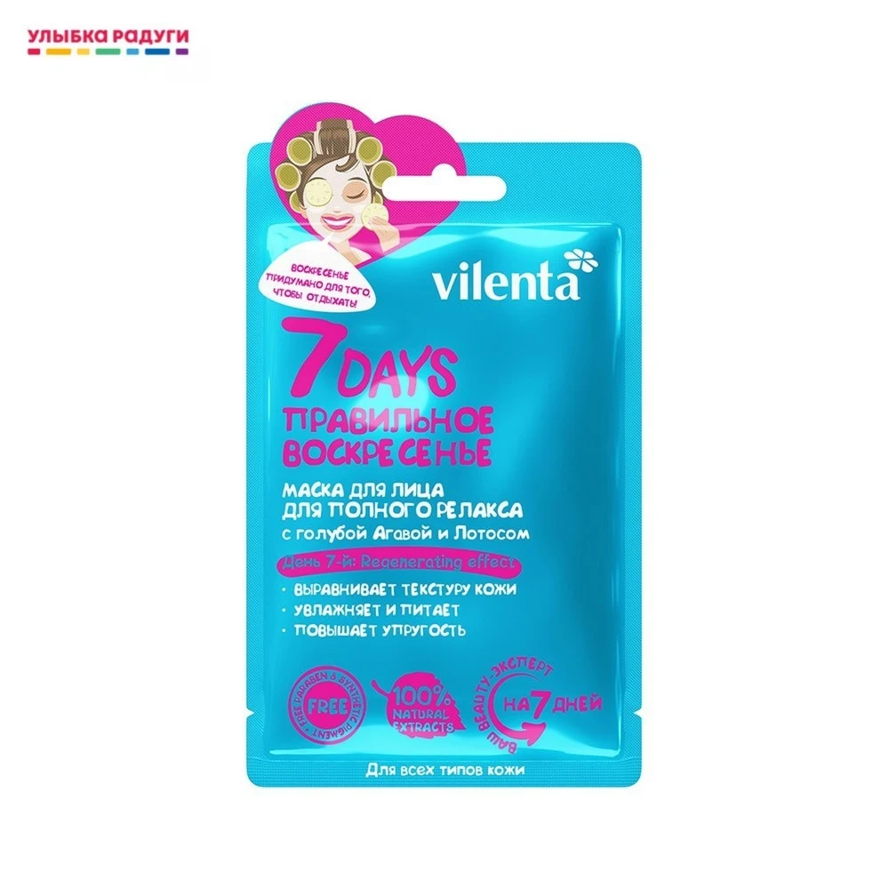Применение: Расправьте маску и нанесите ее на предварительно очищенное лицо на 10–15 минут. Ополосните лицо водой. При желании остатки средства можно не смывать. Для заметного улучшения состояния кожи, рекомендовано использовать всю серию масок «7DAYS» в течение недели. Маска также подходит для разового применения в качестве экспресс-ухода.