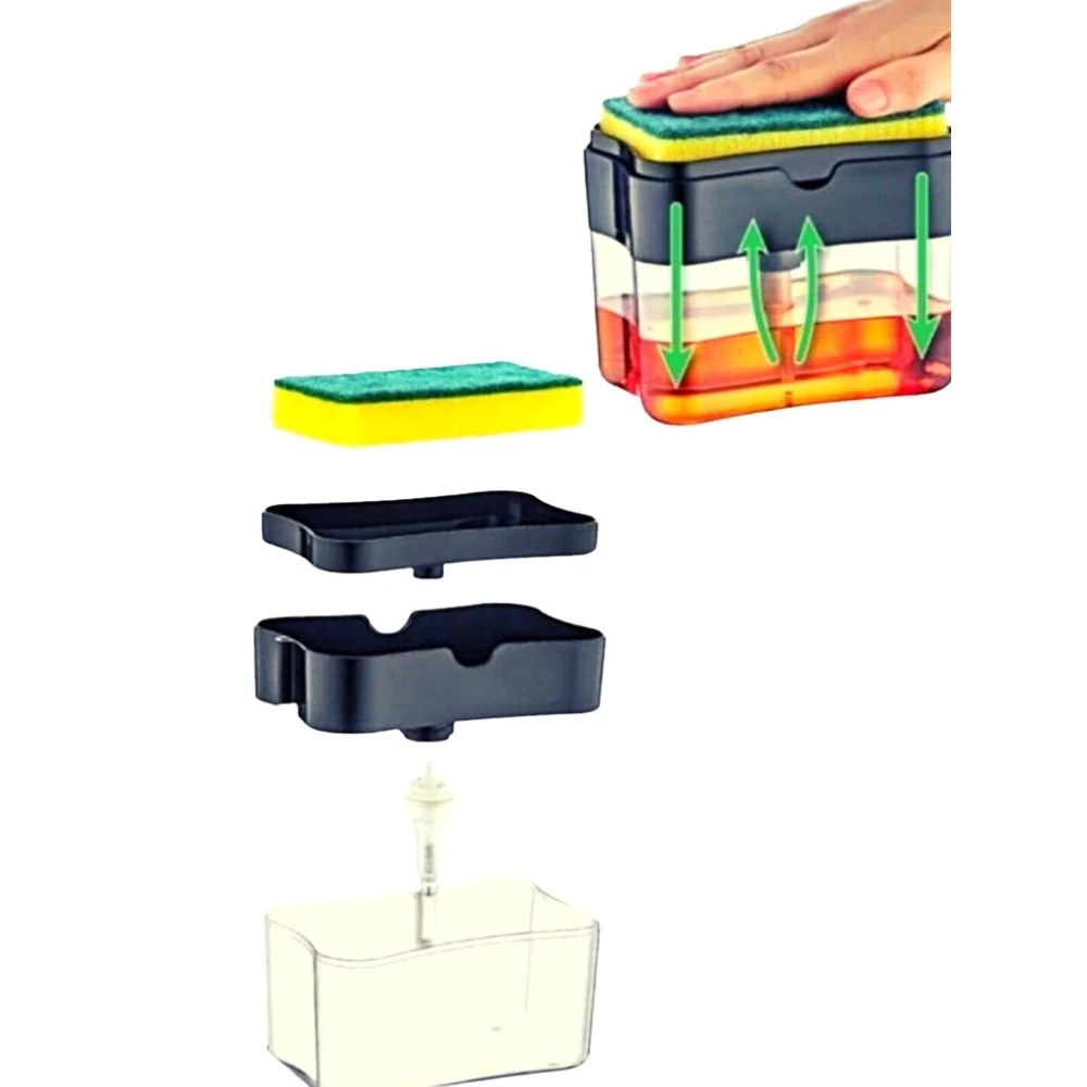 It has a reservoir on which you can put sponges. When you press the reservoir down with the sponge, the mechanism works and the sponge reservoir fills with soap.