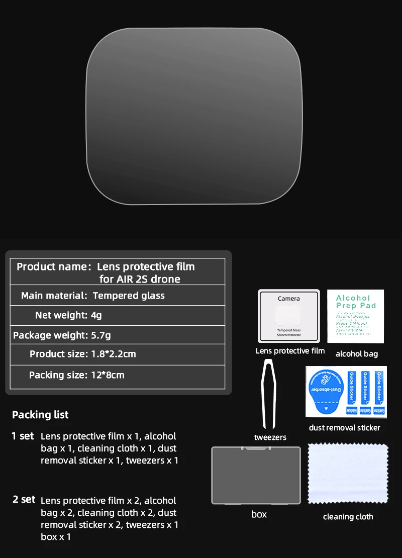 2 set: tempered film x 2, alcohol pack x 2, cleaning cloth x 2, dust removal sticker x 2, tweezers x 1,Box x 1,