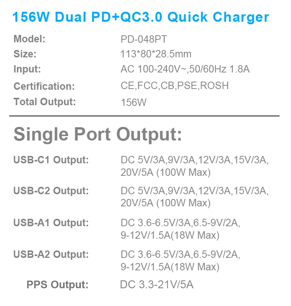 Вход: 100V-240V 50/60Hz 1.8A USB-C1 & C2 (100 Вт) PD3.0: 3,3-21 в/5A; 5 В/3A, 9 В/3A,12 В/3A, 15 в/3A, 20 в/5A USB-A1 и A2 (18 Вт): 3,6-6,5 В/3A, 6,5-9 В/2A, 9-12 В/1.5A Общая мощность: 156 Вт
