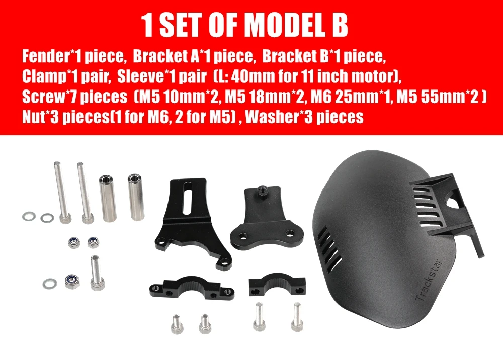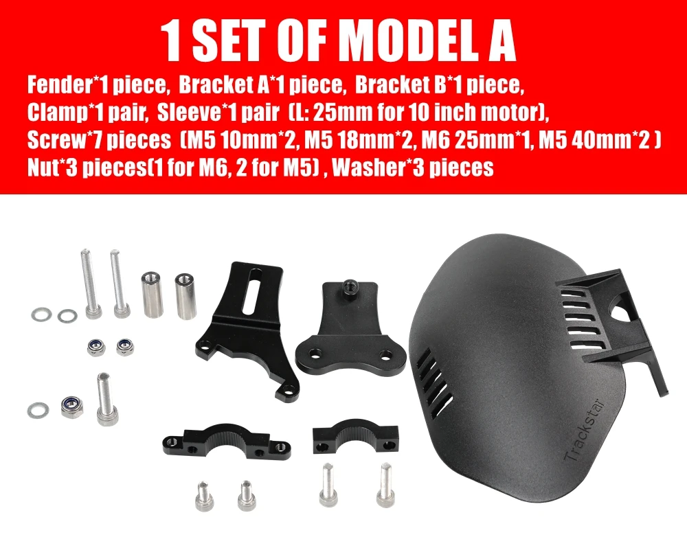 Крыло * 1 шт, кронштейн * 1 шт, кронштейн B * 1 шт., зажим * 1 пара, рукав * 1 пара (L: 25 мм для 10 дюймов мотор или L: 40 мм для 11 дюймового двигателя),