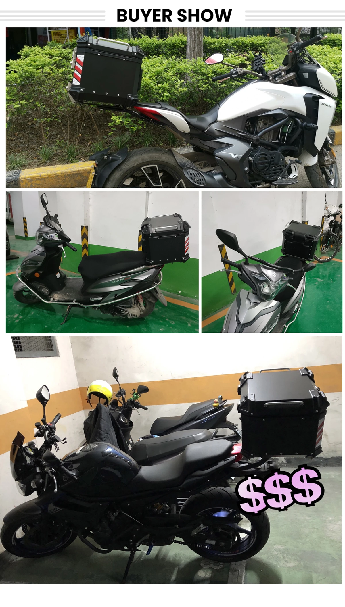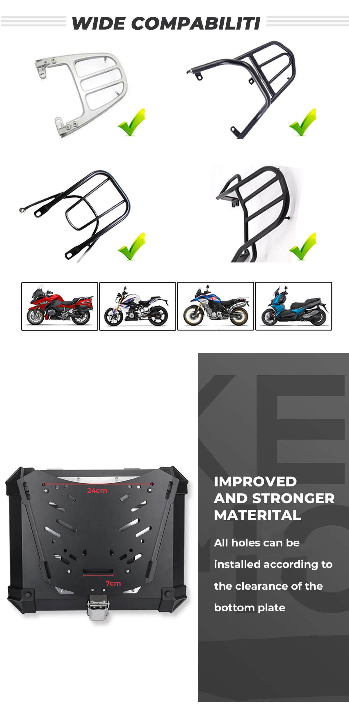 ▲Детали универсального фитинга: эти верхние коробки имеют Универсальное крепление, которое позволяет установить его для большинства мотоциклов и больших скутеров и мопедов. Например: для BMW R1200GS/R1250GS/F800GS... для Suzuki для Honda Africa Twin CRF 1000L /NC700/750... для Triumph для Ducati Для Kawasaki...