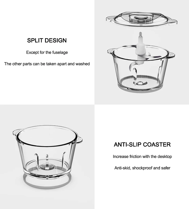 Прозрачная стеклянная чашка для смешивания более удобна для наблюдения за ингредиентами. Чашка для смешивания большой емкости объемом 2,5 л может измельчать 1000 г мяса за раз, может упаковать 30 булочек и 60 пельменей за один раз.