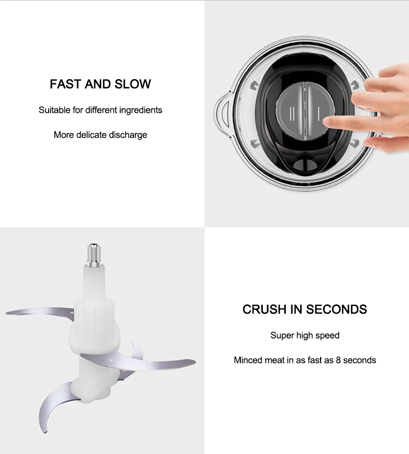 Быстрая и медленная передача подходит для ингредиентов различной твердости, а быстрая передача подходит для твердых и жестких ингредиентов, таких как мясо, морковь, орехи и сладкий картофель. Slow gear подходит для овощей, фруктов, соусов и т. д., степень лакомства легче контролировать.