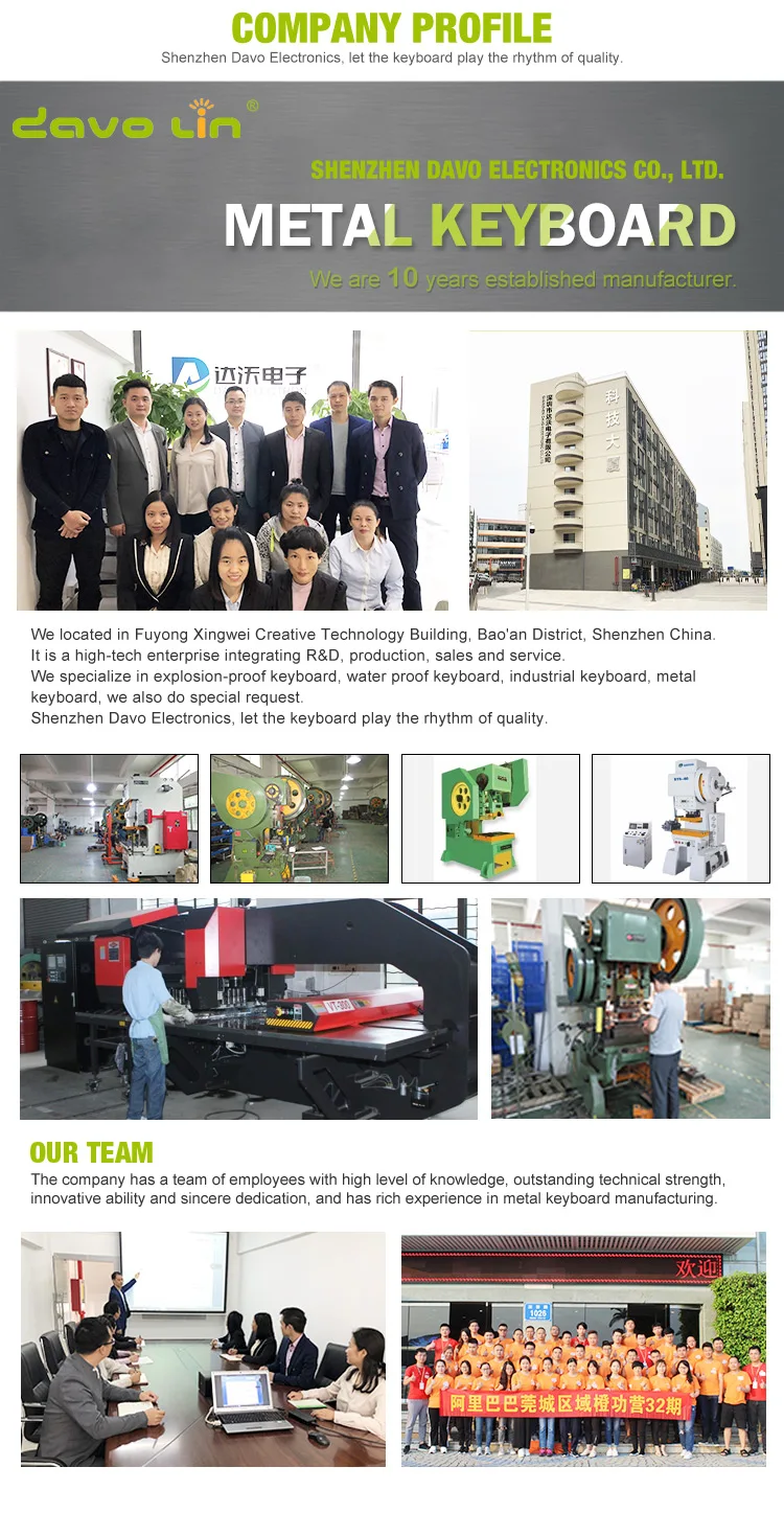 В1) является ли это безопасным при оплате для меня, поскольку мы являемся первым сотрудником? О: мы можем сделать торговую гарантию на Alibaba, которая гарантирует получение ваших продуктов, мы также принимаем другие безопасные способы оплаты, как вы хотите. В2) можете ли вы напечатать логотип на металлической клавиатуре или нарисовать художественное оформление? О: мы можем напечатать ваш собственный логотип на клавиатуре, и мы можем нарисовать для вас произведения искусства, но нам нужен логотип proto. В3) Что я должен предоставить, чтобы получить предложение? Когда я могу получить предложение? О: мы отправим вам предложение в течение 24 часов после того, как вы сообщите нам размер, количество, особые требования и отправьте нам художественное оформление, если это возможно. В4) можете ли вы сделать образец для меня? О: Да, мы можем сделать вам образец для вашего утверждения, но есть плата за образец, который будет возвращен после того, как он достигнет определенного количества. Q5) какой способ доставки вы делаете для металлической клавиатуры? О: мы отправим его Экспресс-доставкой или воздухом для небольшого заказа; Отправим по морю, если это большое количество. В6) вы фабрика? О: да! Shenzhen DAVO является профессиональным производителем металлических клавиатур более 10 лет. Наш инновационный дизайн и превосходное качество делают DAVO популярным во всем мире. В7) Поддерживаете ли вы настройки языка клавиатуры и макета? О: мы поддерживаем бесплатную настройку языка и макета для небольших заказов! В8) можете ли вы настроить поверхность и программу вашего продукта в соответствии с моими требованиями? О: Да. Вам нужно предоставить черновик поверхности! В9) можете ли вы изменить размер панели клавиатуры? О: Да. Мы можем настроить его в соответствии с вашими потребностями! В10) является ли ваша клавиатура водонепроницаемой? О: у нас есть водонепроницаемые металлические клавиатуры с IP65-IP68 градусов. Начните присылать нам запрос с вашим запросом, мы порекомендуем вам правильную модель.