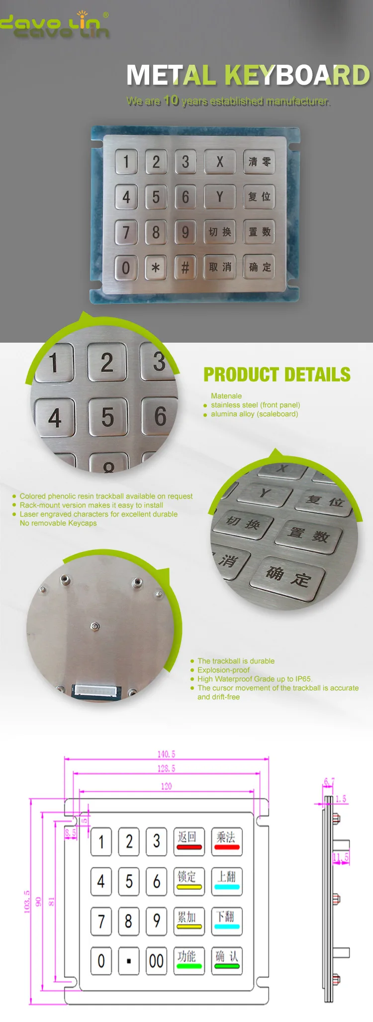 Тип: D-8210 Размер Передняя панель: 120*90 мм Общая панель: 140,5*103,5 мм Основная особенность Металлическая клавиатура с 1,20 кнопками 2. Пыленепроницаемость, водонепроницаемость, сопротивление вандализму 3. Лазерная гравировка легенд для отличной долговечности 4. Может быть очищен мыльной водой, дезинфицирующим средством или другими чистящими средствами Количество клавиш: 20 клавиш Материал: нержавеющая сталь 304 Срок службы ключа Более 2 миллионов операций Ключ: 0,4 мм Стиль крепления: крепление задней панели Напряжение питания: + 5 В постоянного тока +/-5% Интерфейс: USB/PS2/Matrix/RS232 Уровень защиты: IP65 (передняя панель) Рабочая температура:-40 ~ + 70 ℃ Температура хранения:-50 ~ + 80 ℃ Относительная влажность: 30% ~ 90% относительной влажности Атмосферное давление: от 60 до 106 кПа Мтбф> 50000 ч MTTR<30 мин ОС Совместимость с WINDOWS98/ME/2000/XP. И так далее Сертификация: CE, RoHS, FCC Гарантия 1 год ограниченной гарантии, можно обновить дольше Применение Киоск самообслуживания, промышленная система ПК, медицинская и пищевая промышленность, игровой автомат и торговый автомат, навигация и авиация, CNC машина и другое заводское оборудование.