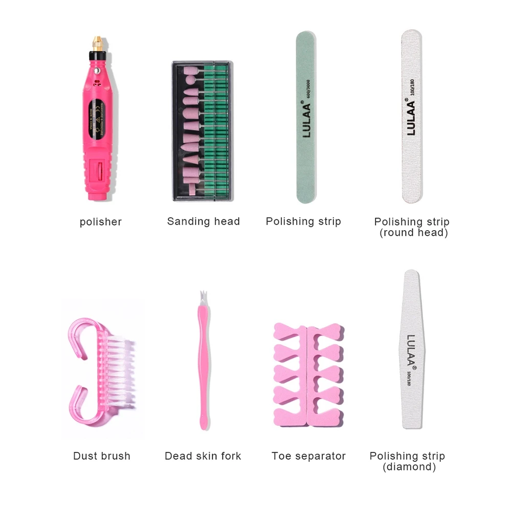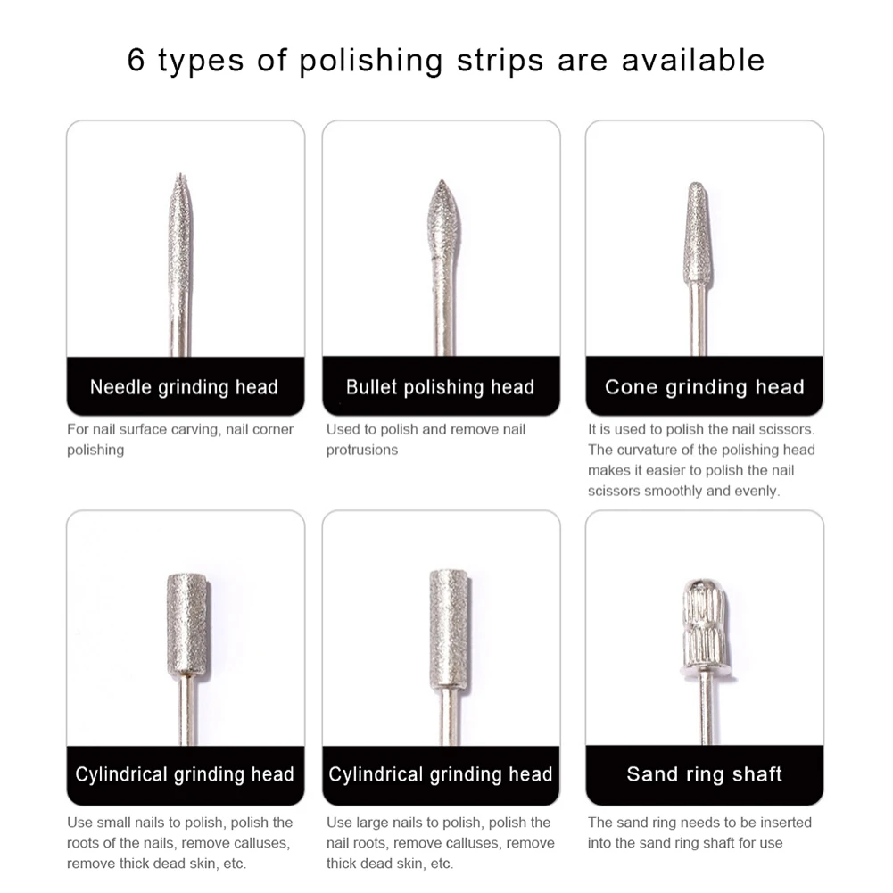 1. Дизайн: профессиональная дрель для ногтей поставляется с 6 металлическими сверлами и другими необходимыми аксессуарами, используемыми для удаления ногтей, гравировки, резки и полировки кутикулы.
