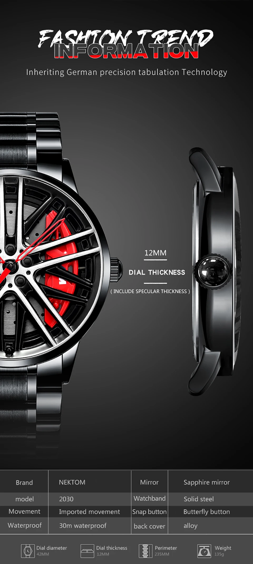 Характеристика: -100% абсолютно новый и хорошего качества -3 АТМ/30 м водонепроницаемый (Ежедневный Водонепроницаемый дизайн, поддержка ручной стирки, мытья лица, мытья автомобиля, дождя) -Минеральное стекло (Hardlex, износостойкость, устойчивость к царапинам, высокая твердость, трансмиссионный светильник) -Внутри часов: полые 3D Автомобильные колеса и тормозные диски (не 3D бумажная печать) полностью Металлическая внутренняя структура -Ремешок из нержавеющей стали (прочный в носке, роскошный и благородный) Посылка включает в себя: -1 x часы NEKTOM -1 x коробка для часов NEKTOM -1 Инструкция -1 х ткань для чистки часов -1 гарантийный талон -1 инструмент для регулировки ремешка Примечание: Возможны отклонения в 0-1 см вследствие измерений вручную.