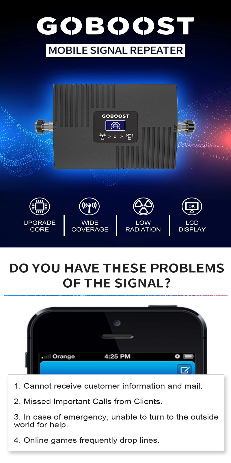 Во-первых:Убедитесь, что вы можете получить как минимум 3 бара сигнала на открытом воздухе (поставить наружную антенну) перед покупкой, в противном случае этот продукт не может вам помочь. Для улучшения сигнала в помещении необходим хороший внешний сигнал.