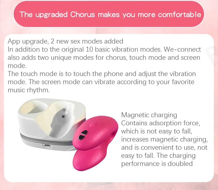 Хор очень подходит для изменения сексуальной жизни и может носиться во время полового контакта, чтобы избежать стимуляции клитора и точки G. Этот вибратор с функцией дистанционного управления, работающий с помощью приложения, несет шок для обеих сторон. Сенсорный датчик на игрушке реагирует на ваше движение самым удивительным крещендо.