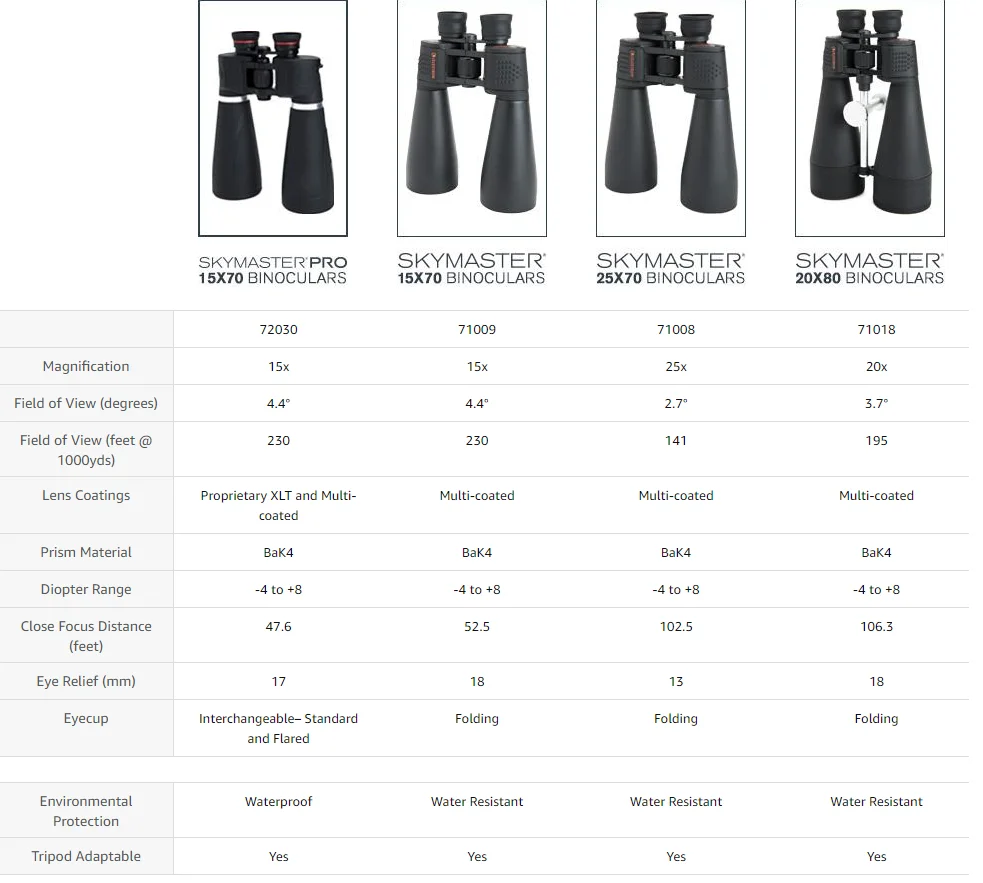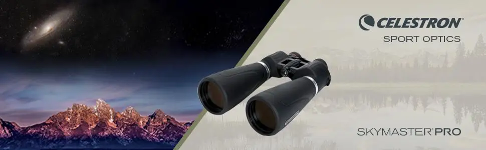 Product description Size:15x70 | Configuration:Binoculars SkyMaster Pro binoculars are the ideal choice for amateur astronomers or anyone that observes at great distances. Compared to lower-priced large aperture binoculars, SkyMaster Pro uses superior optics, coatings, internal parts and housing materials. With large objective lenses, BaK-4 prisms and fully multi-coated optics utilizing Celestron’s proprietary XLT coating technology, the view through a SkyMaster Pro is second to none at this price point. Massive Objective Lenses - The 70 mm objective lenses have tremendous light gathering capabilities, delivering superior low light performance, even in the dimmest conditions. Choose SkyMaster Pro for use at dusk, dawn and nighttime astronomical viewing. Fully Multi-Coated Optics and BaK-4 Prisms - Every air-to-glass surface is multi-coated with Celestron’s proprietary XLT coating technology. These coatings coupled with BaK-4 prisms increase light transmission through the optical path and deliver crisp, high contrast images with outstanding resolution. Built in Tripod Adapter - The built in tripod adapter of the SkyMaster Pro 15x70 allows the binocular to be attached to a tripod for added stability during longer viewing sessions and also allows a red-dot finder to be attached to it utilizing the included RSR “Reflex Sight Ready” Rail. When properly aligned with the binocular, the red-dot finder will allow objects to be brought into view quickly. RSR “Reflex Sight Ready” Rail - The tripod adapter included with the SkyMaster Pro not only allows the binocular to be attached to a tripod for added stability during longer viewing sessions, but also includes a removable rail for attaching a red dot finderscope. When properly aligned with the binocular, a red-dot finder helps you locate objects quickly and center them in the binocular. Lightweight, Waterproof Construction - A polycarbonate and aluminum housing makes SkyMaster Pro durable and lightweight. The housing’s protective rubber armor is extremely rugged and can stand up to tough use. The fully waterproof housing for use in all weather conditions provides peace of mind when unexpected weather rolls in. The housing is also filled with dry nitrogen gas to prevent the internal lenses from fogging when moving between extreme temperatures or when using the binocular in damp conditions. Extended Eye Relief - 17 mm of eye relief allows for comfortable viewing for both eyeglass and non-eyeglass wearers. Eyeglass wearers can see the entire field of view while looking through the eyepiece with their glasses on. For those that do not wear eyeglasses, the rubber eyecup positions the users eye behind the eyepiece at the correct distance for optimal viewing. Enhanced Magnification - Bring distant objects into view with 15x magnification—great for observing celestial objects in greater detail, searching for wildlife in the brush or viewing a distant object on the horizon.